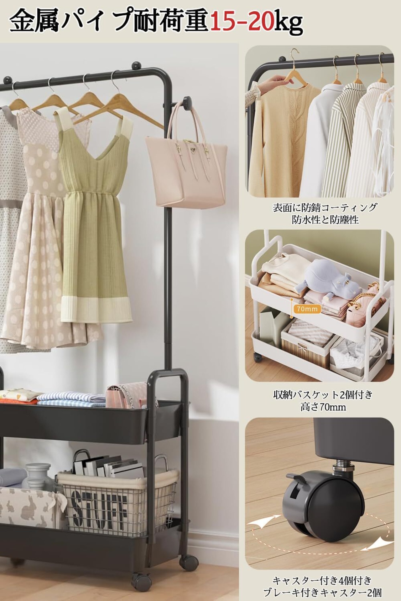 【高耐荷重】この洋服掛け 収納付きは、表面に防錆コーティングがスプレーされた厚手の高品質の金属パイプで作られており、耐荷重15-20kg、防水性と防塵性、掃除が簡単で。スリム衣架は材質から構造まで最大限の安定性と耐久性を確保するために設計されています。
