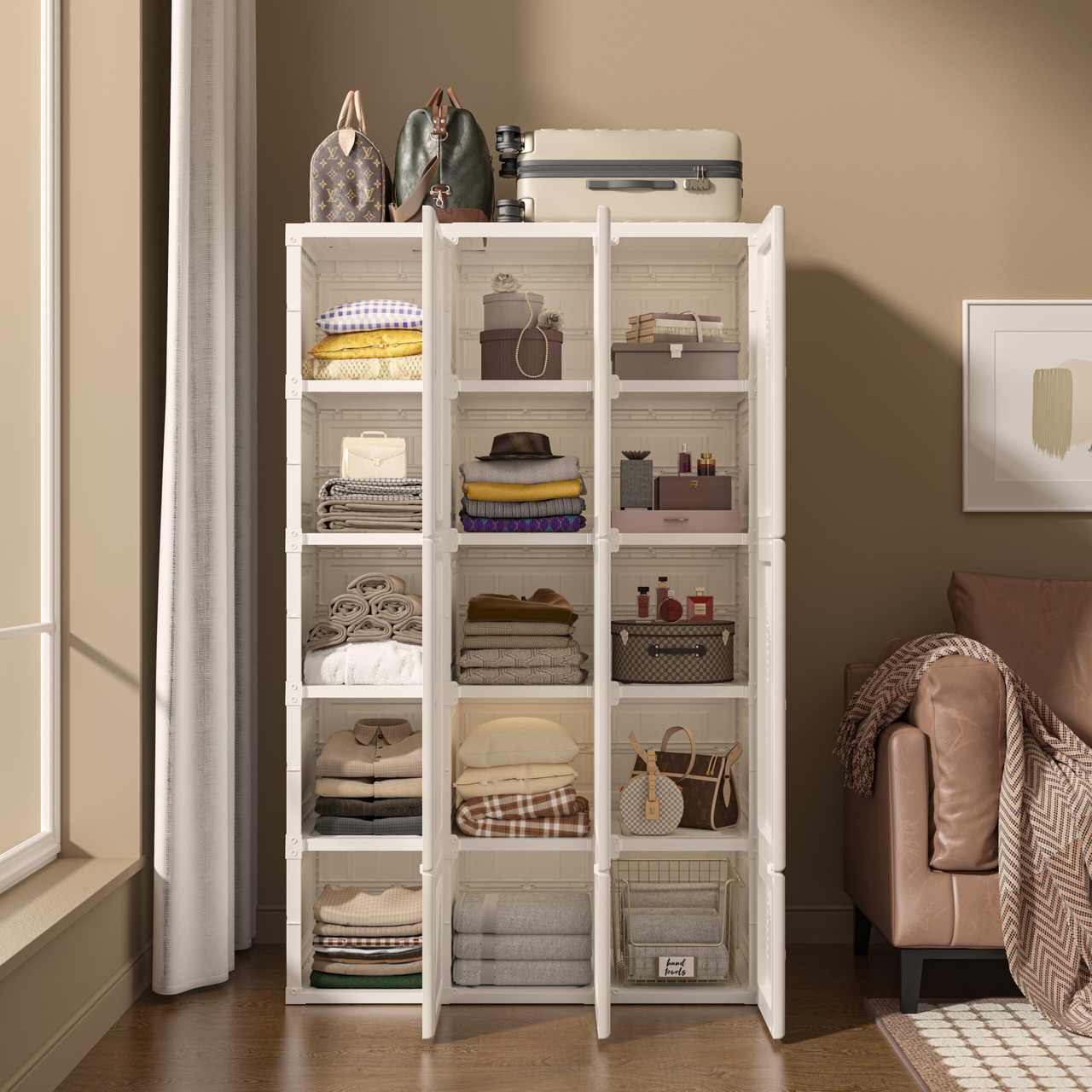 【特価セール】Mayi Box ワードローブ クローゼット 大容量 ハンガーラック シンプル収納棚 衣類ケース 一体折り畳み式 洋服収納ラック 扉付き 雑物 小物 耐荷重 省スペース 頑丈 リビング (15グリッド)