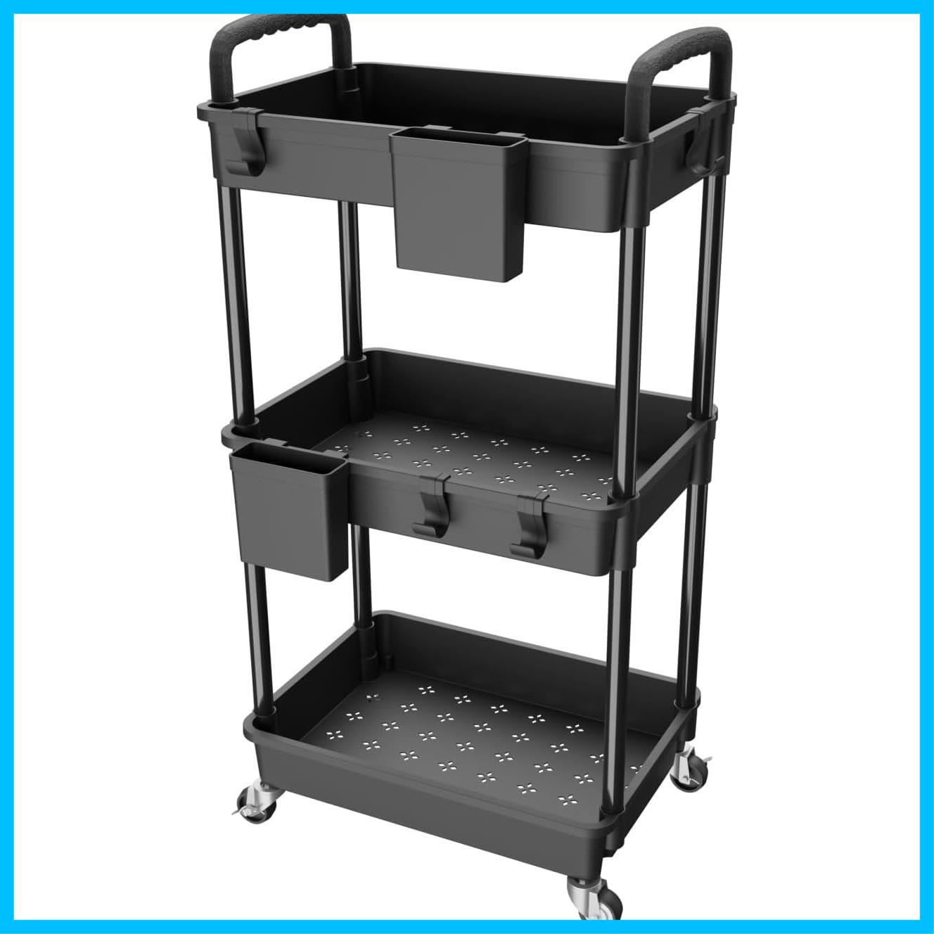 【数量限定】キッチンワゴン ワゴン キャスター付き 3段 スリム 収納ワゴン 大容量 収納カート ハンドル/収納カップ付き ペットボトル収納 洗面所 台所 トイレ 浴室 冷蔵庫横 組立簡単 幅38×奥行27×高さ74cm ブラック