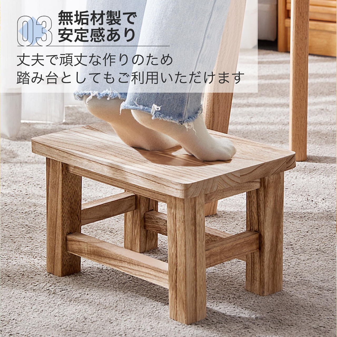 【無垢材製で安定感あり】 丈夫で頑丈な作りのため、踏み台としてもご利用いただけます。 木製の脚の底には傷防止と滑り止めが付いています。