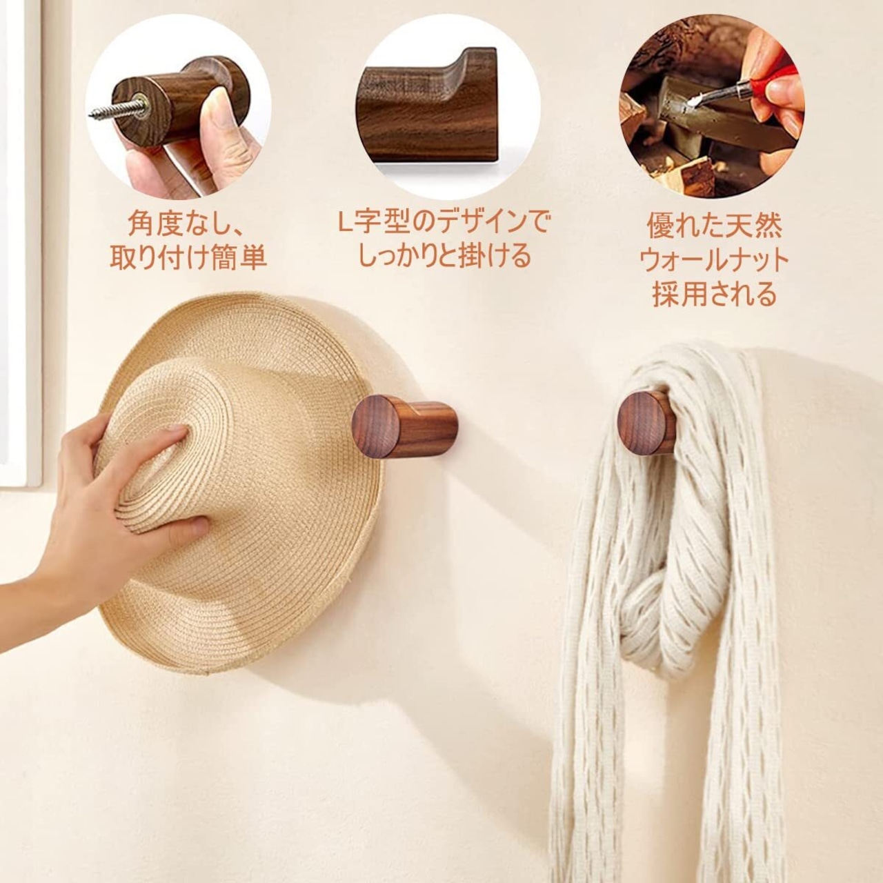 【特価セール】壁掛けフック 木製 北欧 おしゃれ 6個入れ L字 ウォールハンガー ブナ木製ウォールフック ウォールナット 帽子、コート、洋服掛け 玄関、寝室用 丈夫で長持ち ネジ付き(胡桃色、長さ5cm×直径3.5cm、耐荷重10KG)