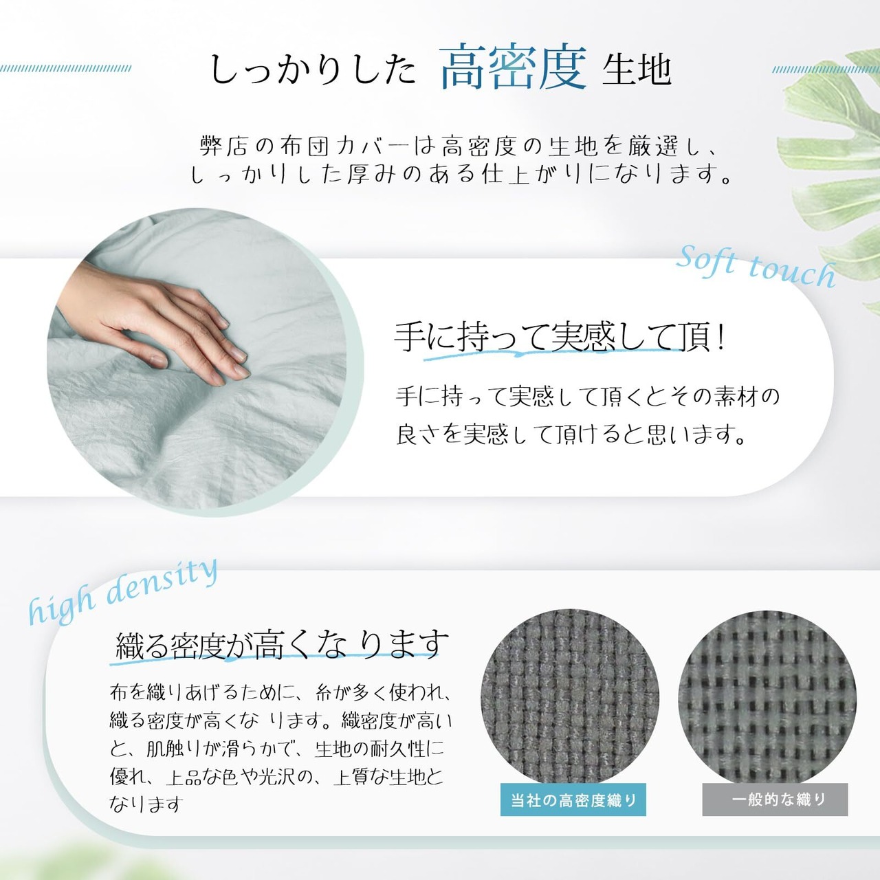 【洗いざらし+極柔な肌触り】:掛け布団カバーの生地を何度も洗って自然な風合いがでて更にピーチスキン加工して最初から肌になじむように仕上げました。洗濯ごとにもっと柔らかくなり、毛玉やほつれができにくく、静電気も少ないので、耐用性がよい長く愛用できます。