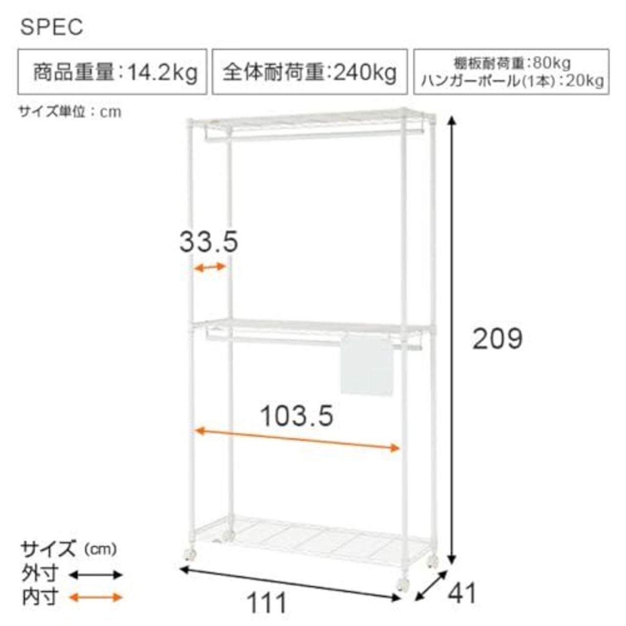 耐荷重:全体:240kg/棚板1枚あたり:80kg/ハンガーポール(1本):20kg
