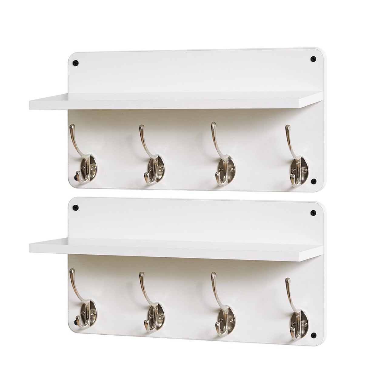 YMYNYハンガーラック壁掛け式、木製ハンガー、2点セット、8つのフック付き通路ハンガー、80 cm Lフローティング棚、キーホルダー、キッチン、バスルーム、リビング、白い色 JPHWS006W-2
