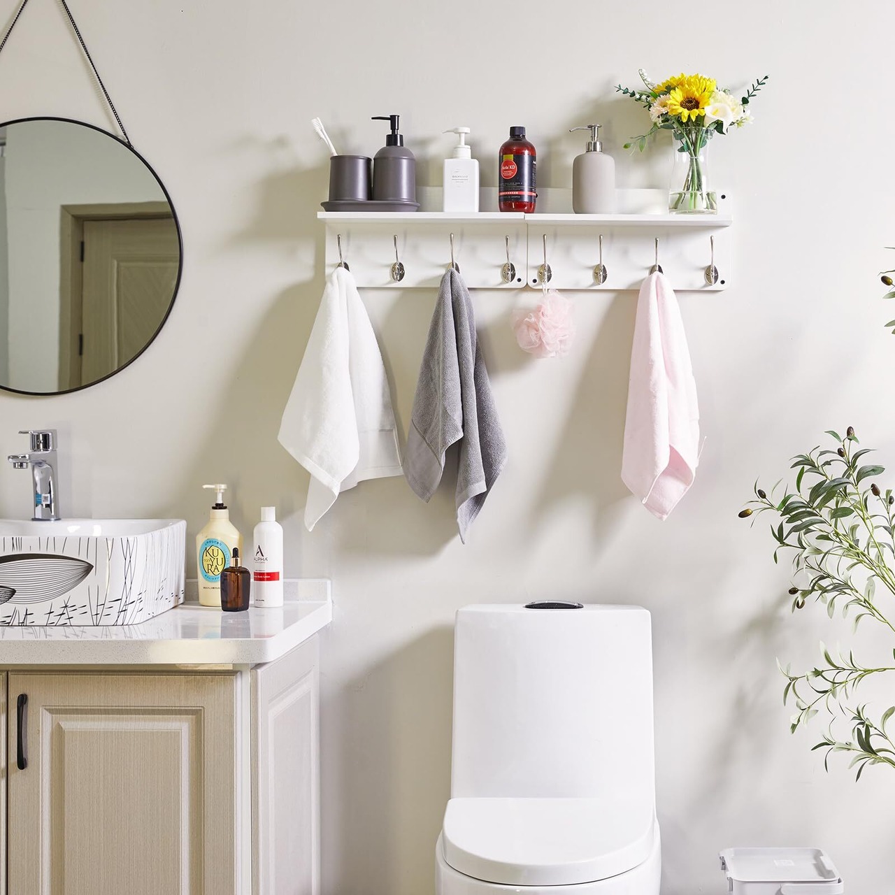 【新着商品】YMYNYハンガーラック壁掛け式、木製ハンガー、2点セット、8つのフック付き通路ハンガー、80 cm Lフローティング棚、キーホルダー、キッチン、バスルーム、リビング、白い色 JPHWS006W-2