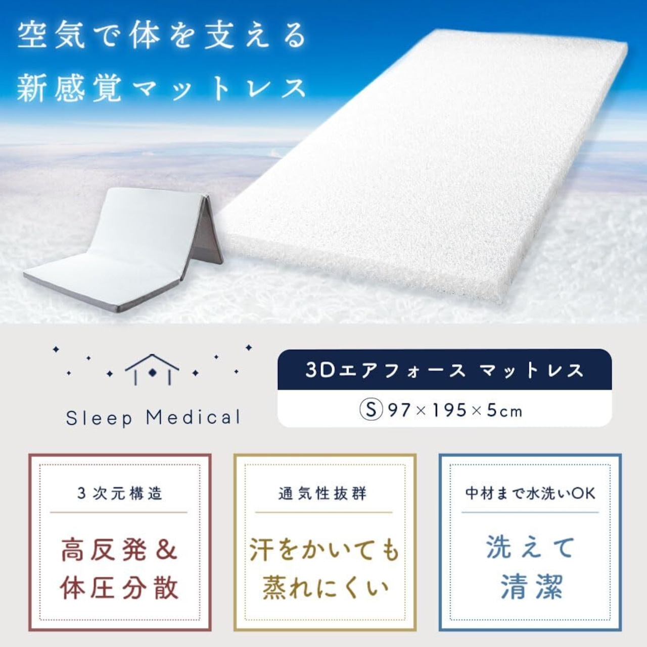 スリープメディカル マットレス 【新感覚マットレス】 「3Dエアフォース」 シングル 97×195×5cm 高反発 体圧分散 寝返り メッシュ ファイバー 通気性 洗える 丸洗い 3次元構造 中空繊維 三つ折り 三つ折りマットレス マット 三つ折り バランス