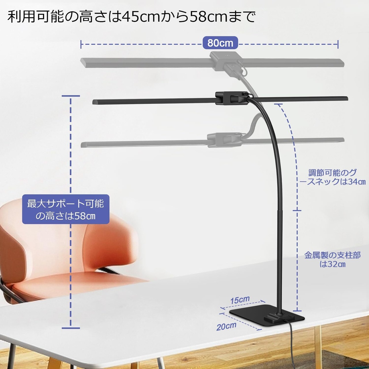 80CMのライトバーがデスク全体を均一に明るい照らす:LEDデスクライト本体の横幅の長さは80㎝ですので、机の端から端までが、びっくりするくらい明るくなります。ライトバーは2本に分かれていて、広げたり閉じたりすることで0度~180度まで調節できます。仕事・勉強・読書・試験・作業など様々な用途に使用できます
