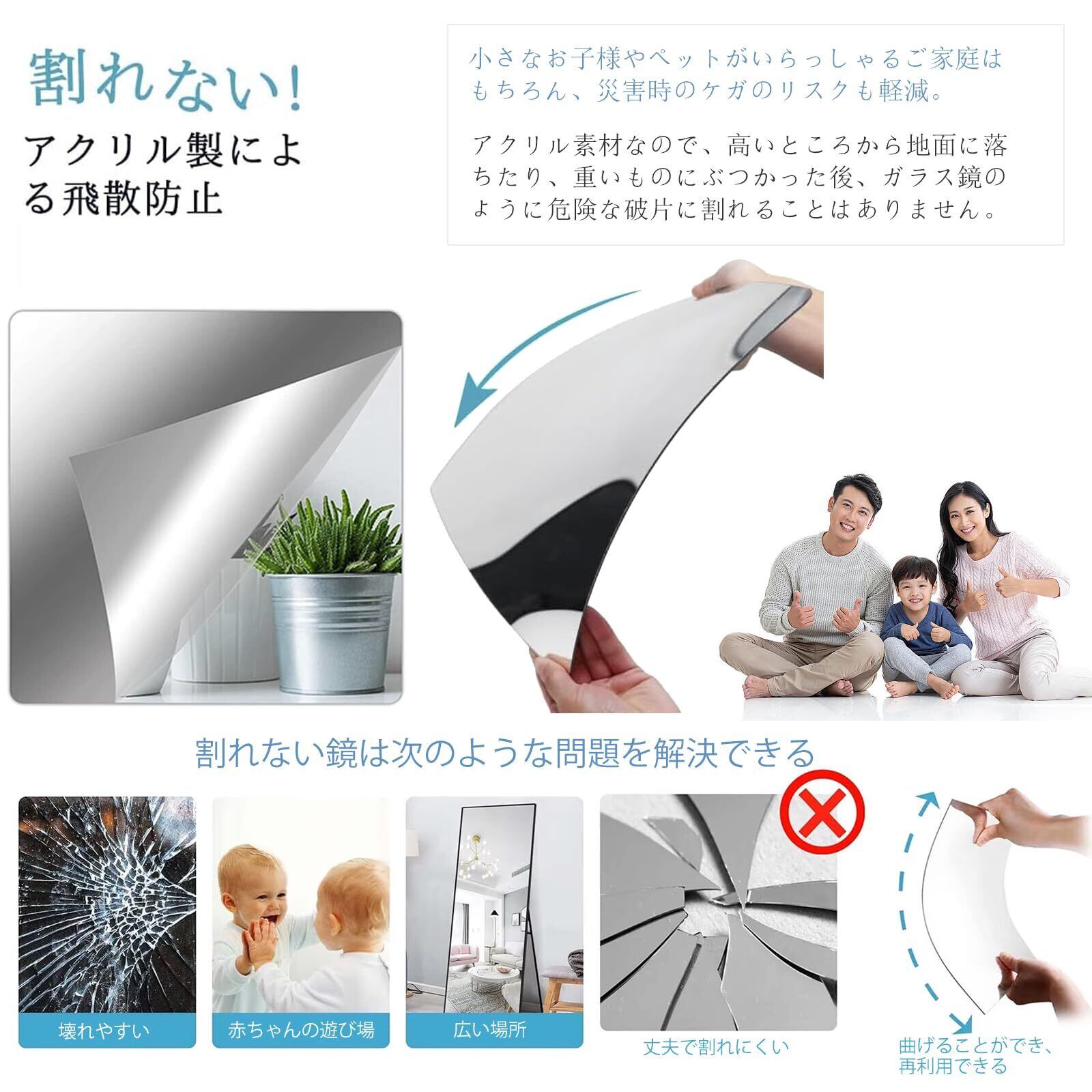 【割れにくい&地震対策】アクリル製のフィルムミラーはガラスよりも耐衝撃性が高く、割れにくいため、子どもやペットがいる家庭でも安心です。壁に貼る鏡や鏡壁、ドア掛けミラーとしても使え、全身鏡や姿見 おしゃれなデザインにも最適です。鏡 シートや鏡 シールのように簡単に貼り付けられ、軽量でミラーの割れない特性を活かしています。地震時にも安全です。