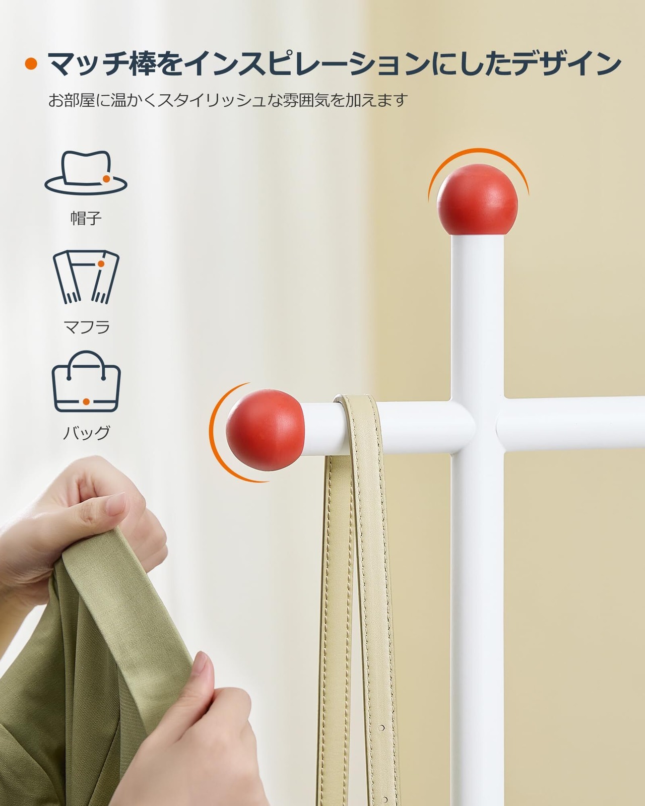 【独特な外観デザイン】マッチ棒をインスピレーションにしたデザインが目を引くこのハンガーラックは、ファッションと実用性を兼ね備えており、お部屋に温かい雰囲気を演出します。また、帽子やバッグをかけるポールハンガーとしても使用できます。洋服掛けだけでなく、小物の整理にも最適です!日常の使いやすさを追求しました。