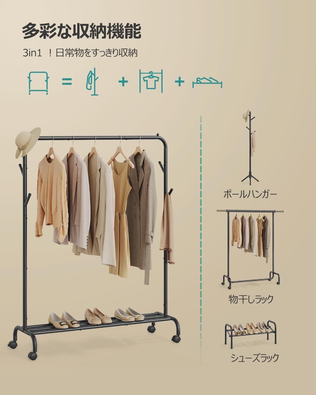 【移動がらくらく】四つのキャスターがあり、服などを掛けたままでスムーズに移動でき、お掃除も便利になります。さらに、ストッパー付きで静止時はシッカリと固定できます。
