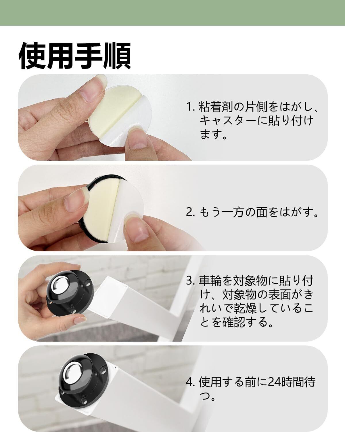 【粘着力が強いカスタマイズテープ】各キャスターにはカスタマイズされた粘着テープが付属しています。カスタマイズされたテープは粘着力が強いので、家具の底から簡単に分離することはありません。注意:取り付け後24時間経ってから使用すると、より良い結果が得られます!