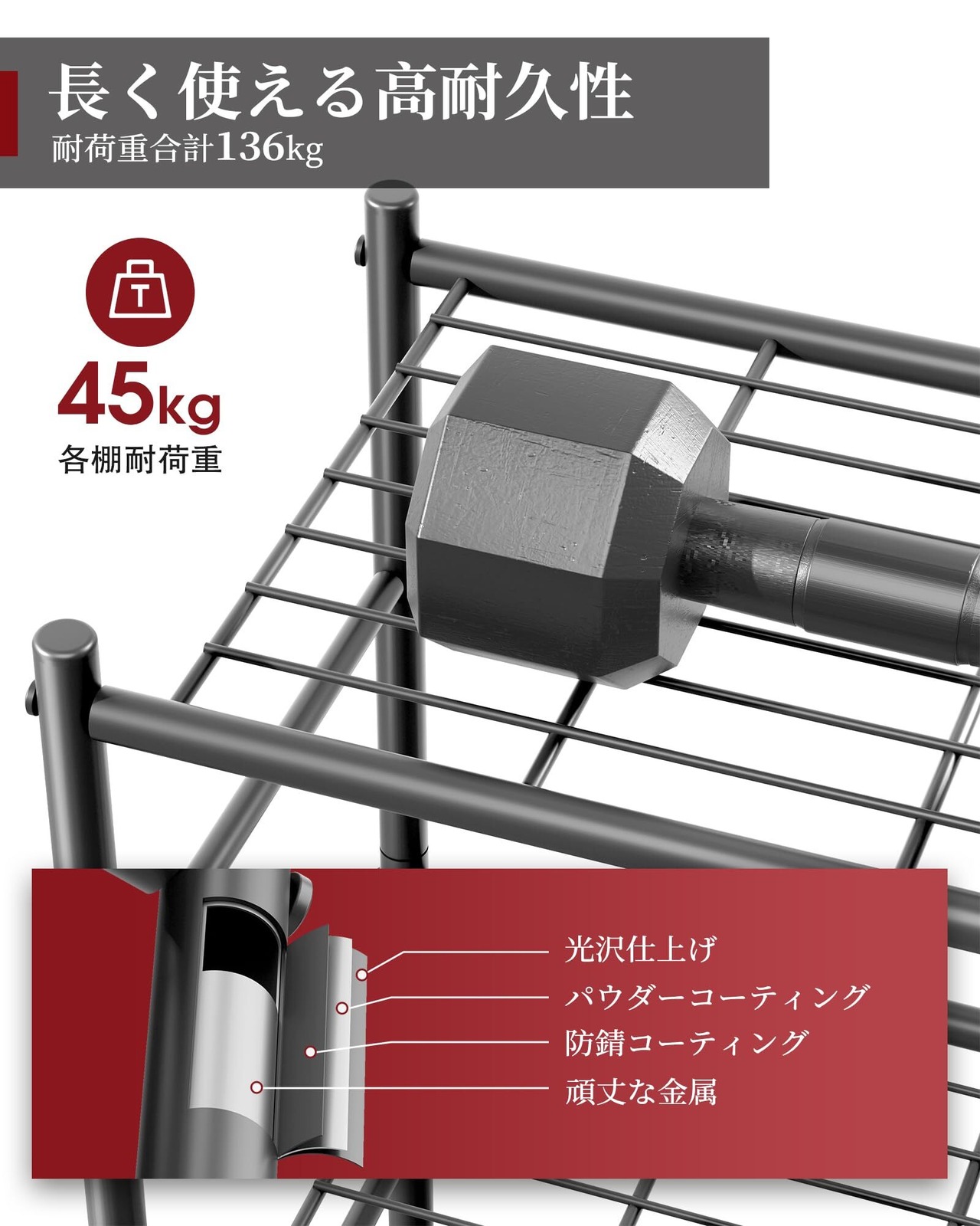 安定感抜群:棚 ラック は強化構造を採用し、各棚は 45.4kg の耐荷重を備え、重いアイテムもしっかり収納できます。さらに、4つの調整可能なアジャスター付きで、床が不安定な場合でもしっかり固定可能。各脚を調整することで、ぐらつきを防ぎ、安全で安定した設置が可能です。