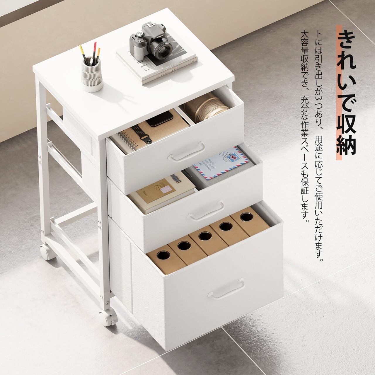 デスクワゴン サイドワゴン キャビネット オフィスワゴン 布製 袖机 キャスター付き 3段 A4対応 大容量 デスク下収納 柜子 幅390*奥行300*高さ680mm 白い