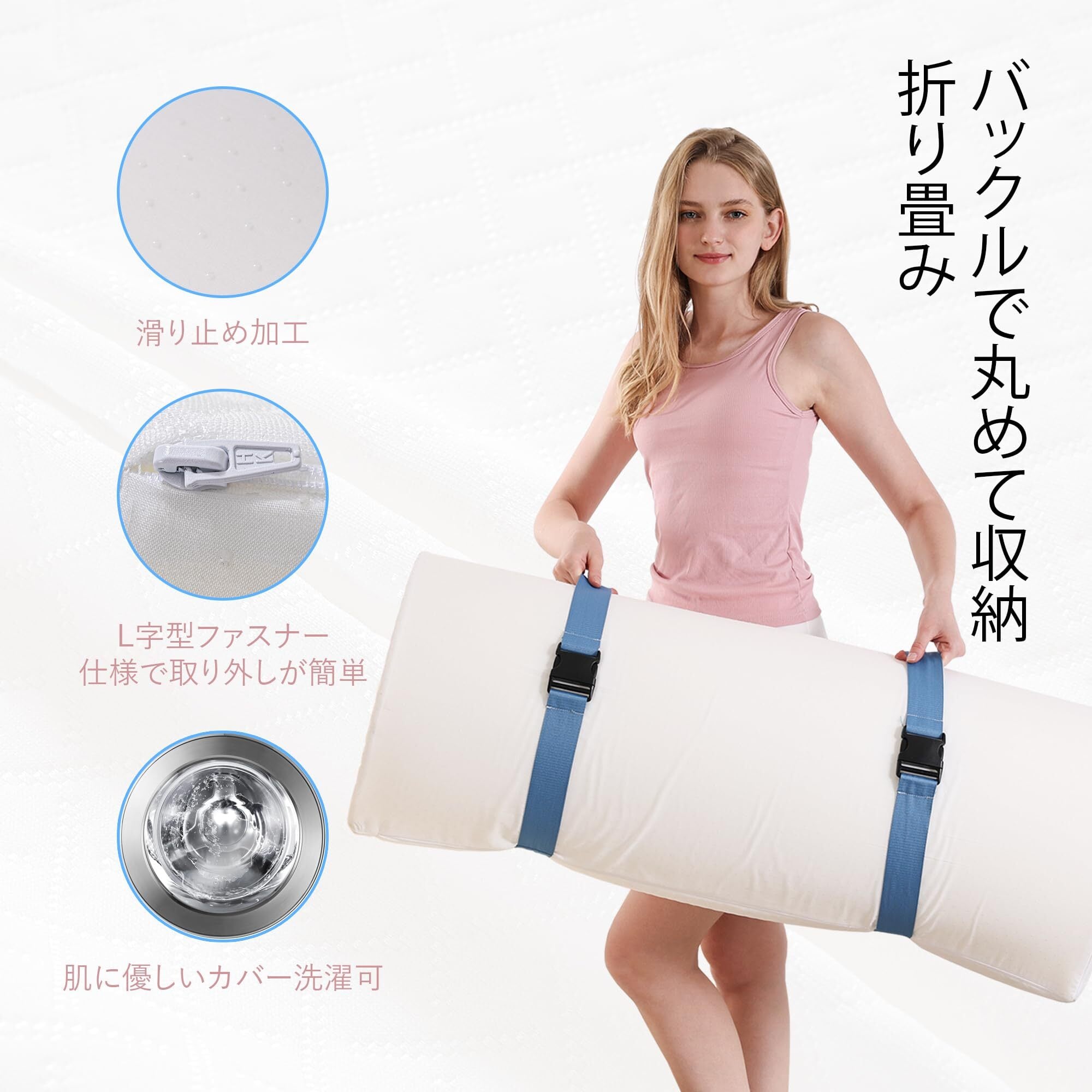 【便利な収納と清潔維持】収納用バックル付きで、マットレスを丸めて省スペースに収納可能です。カバーにはL字ファスナーがあり、取り外して洗濯できます。清潔な状態を維持しやすく、長くご使用いただけます。