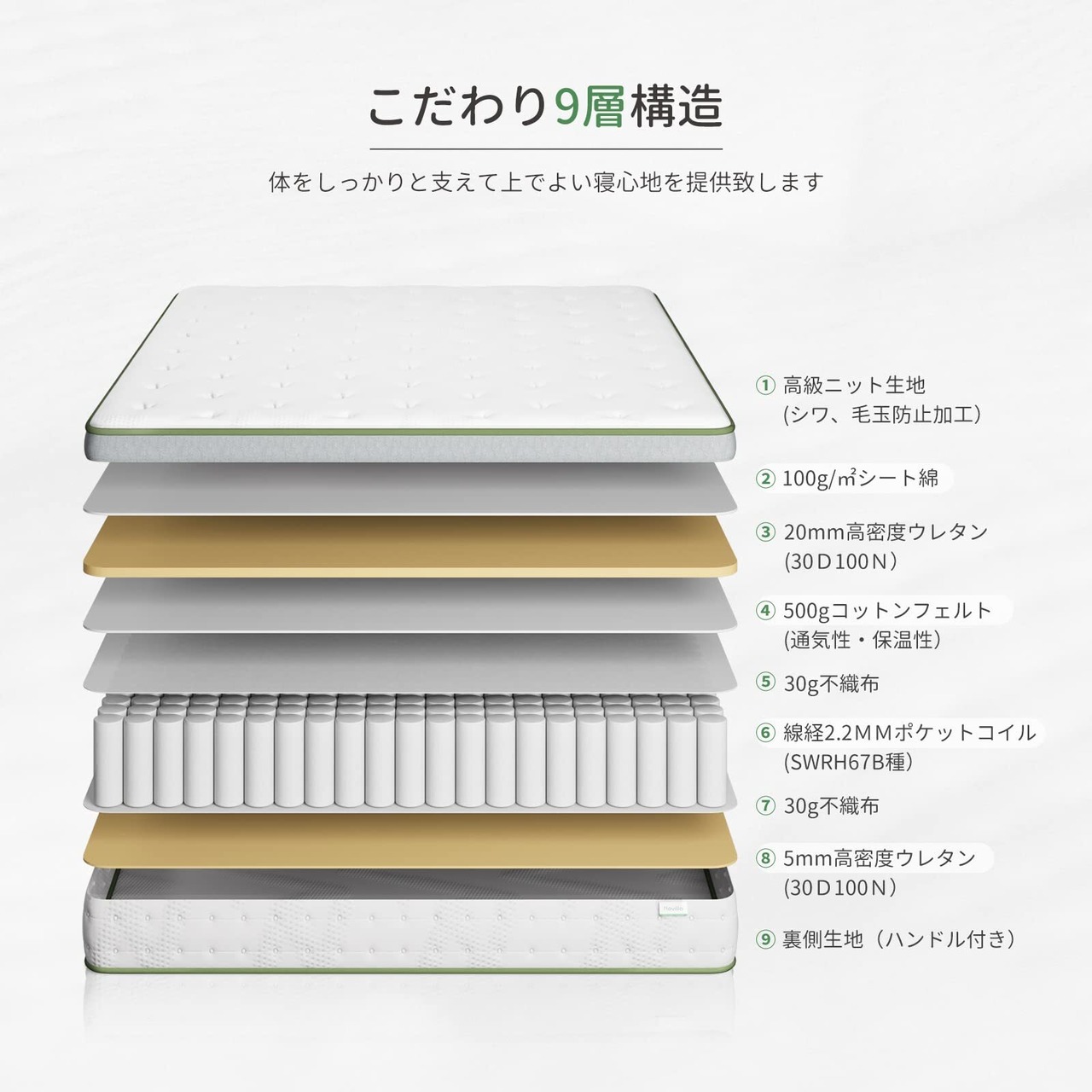 【硬め高反発ポケットコイルマットレス】20CM ベッドマットレス,線径2.2mmと通常よりも太い耐久性の高いコイル、エッジサポート構造で、長くお使いいただけます。