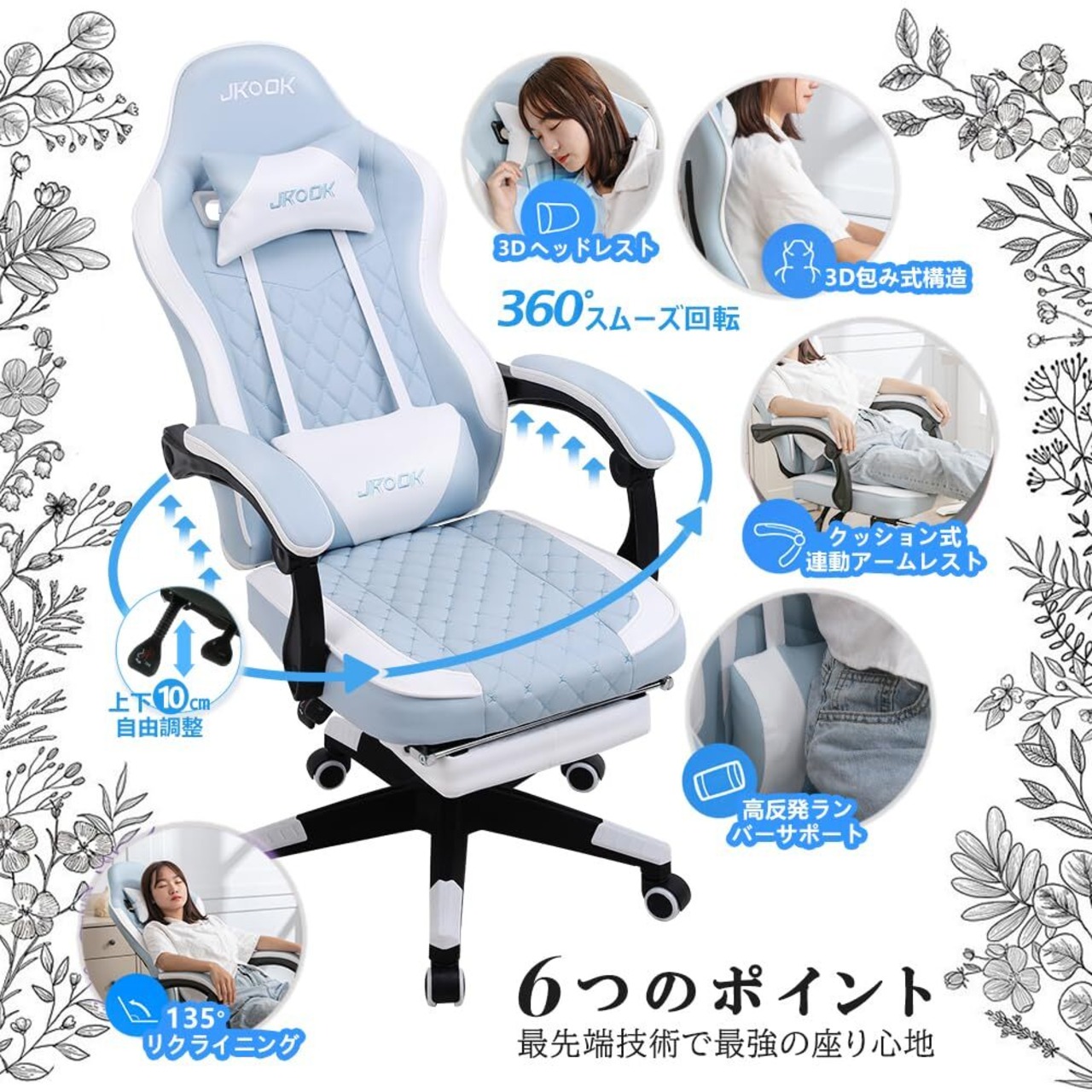 JKOOK ゲーミングチェア オットマン付き 多機能 連動ひじ掛け ゲーム用 デスクチェア 男女兼用 学習椅子 PUレザー JK08 (水色)