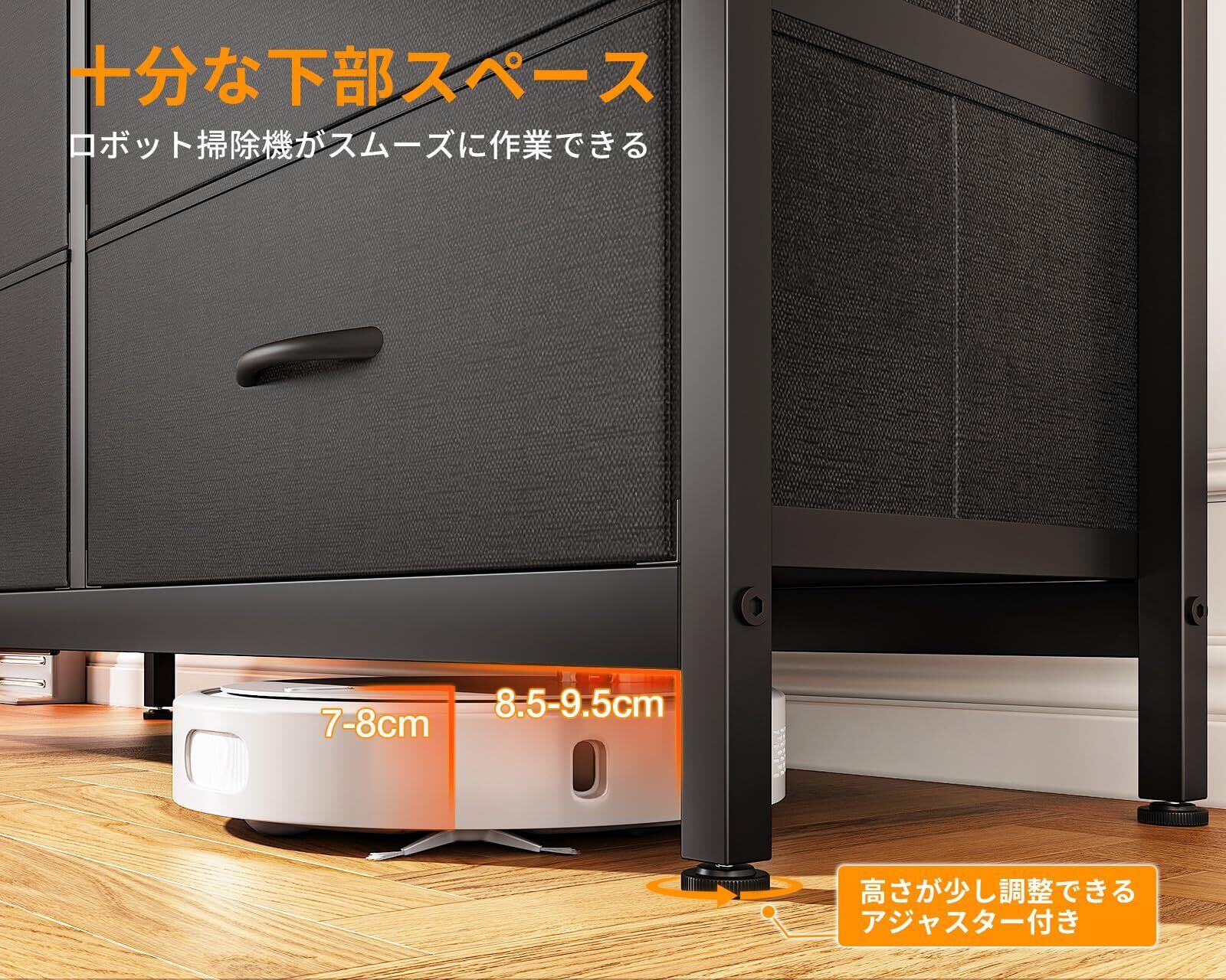 【細部設計にこだわる】高さが少し調整できるアジャスターが付いているので、下部には十分なスペースがあり、棚の移動不要でロボット掃除機がスムーズに作業できる。頑丈な鉄骨構造と壁用固定具が付属しており、タンスの揺れを最大限に抑え、いつも安心、安全的にご利用いただけます。