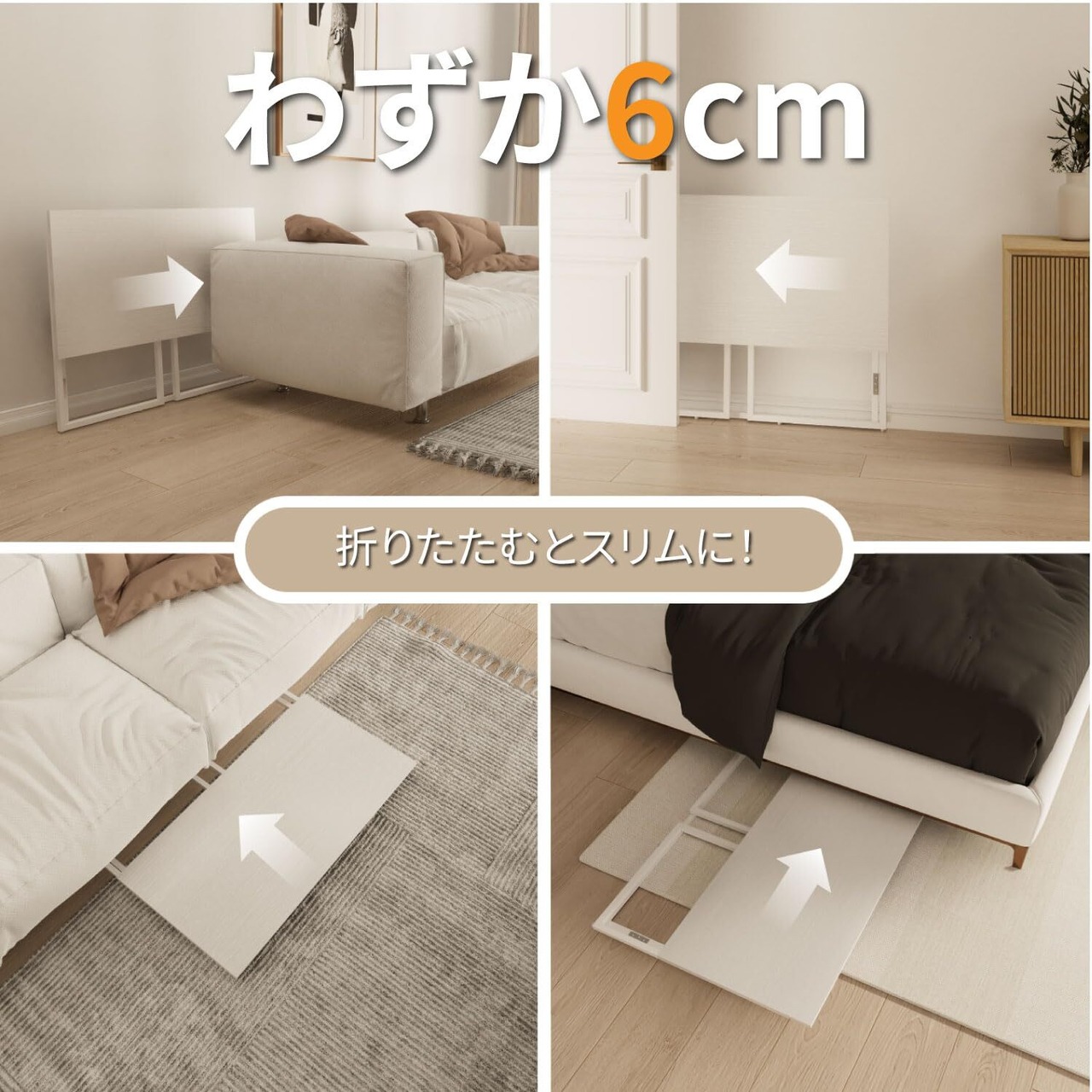 薄型に折りたためて手軽に使える折りたたみテーブル。コンパクトサイズ で折りたたむと約6cmのスリムになり、隙間やベッド下に収納することができます。