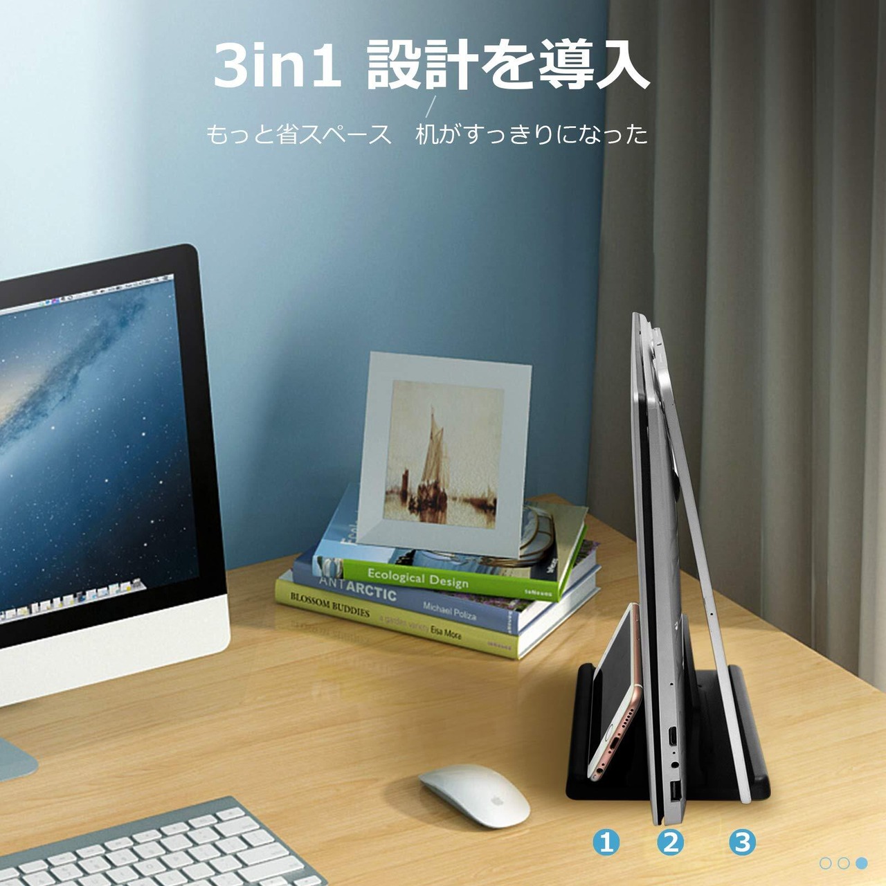 UL ノートパソコンスタンド 縦置き【2023年ニューデザイン】ノートPC クラムシェルモード 机 整理 ABS樹脂製 傷つかない 電波干渉なし mac mini ipad iphone キーボード 同時収納 幅調整可