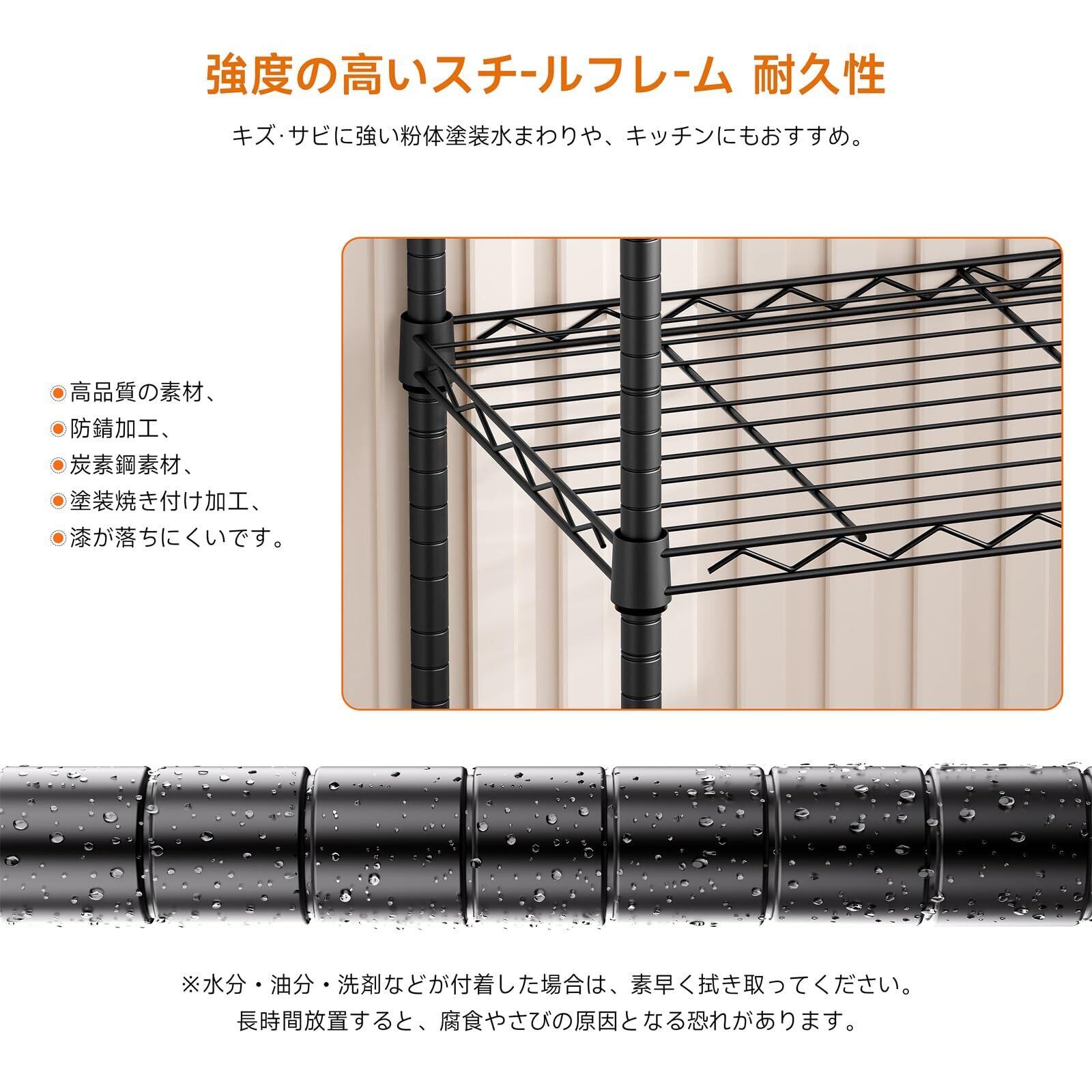 頑丈な金属素材とアジャスター付き:この収納ラックは頑丈で耐久性のある高品質のスチールで作られており、炭素鋼素材の表面はコーティングで覆い、縁も滑らかで、収納棚はサビとキズを防ぐことができます。このスチールラックは底部には円形のアジャスターが取り付けられており、棚の転倒を効果的に防止し、床も傷つきにくいです。凹凸のある地面に対応するために調整可能な脚。家の使用環境に応じて適切な高さを選択できます。