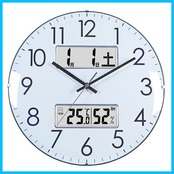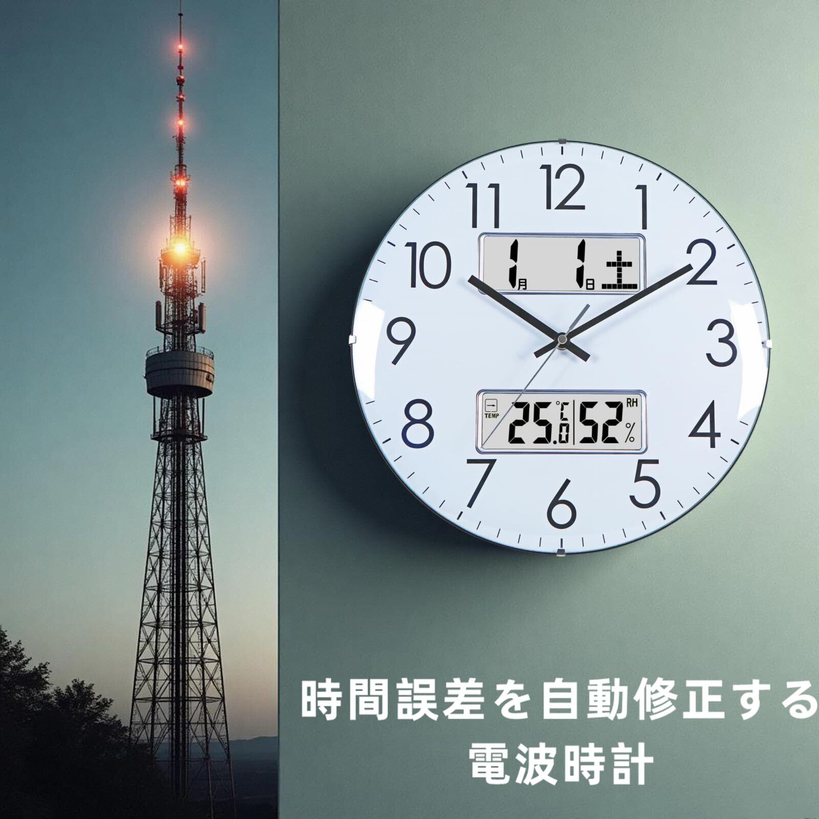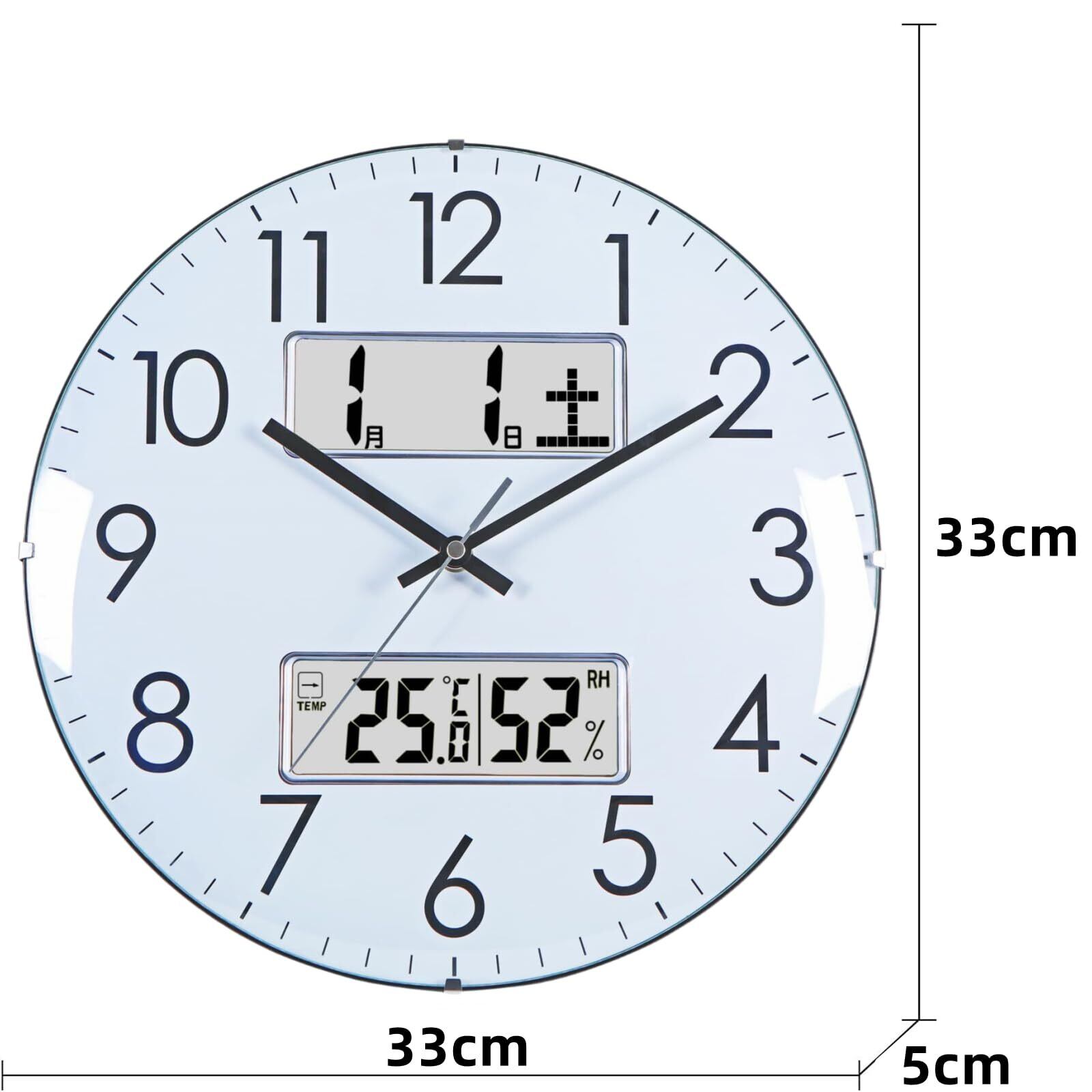 掛け時計 電波時計 温度・湿度・日付・曜日表示 33cm直径 アナログ 夜間秒針止まり(22時~6時) 静音 球面ガラス ホワイト