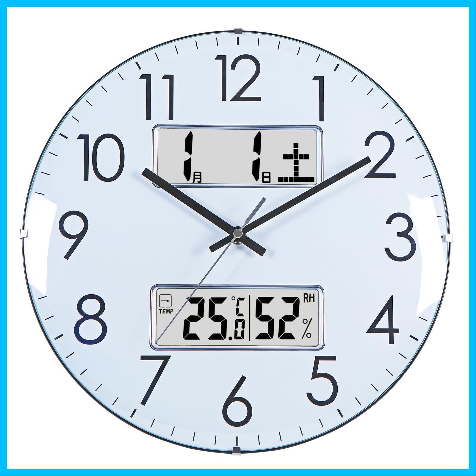 【数量限定】掛け時計 電波時計 温度・湿度・日付・曜日表示 33cm直径 アナログ 夜間秒針止まり(22時~6時) 静音 球面ガラス ホワイト