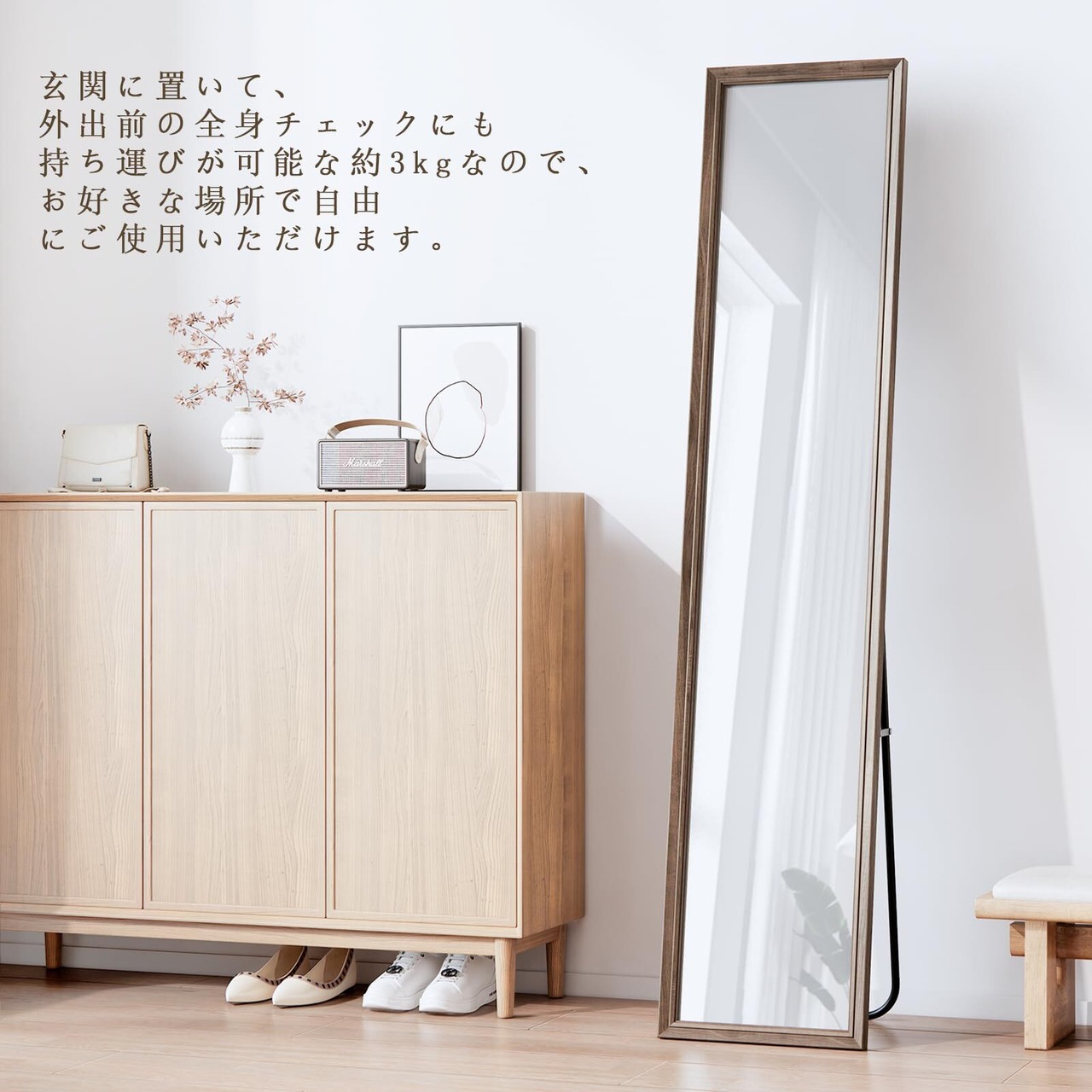 【シンプルで効率的なデザイン】当全身鏡は、組立不要で、安定したスタンド式設計が特徴です。煩わしい釘打ちや複雑な組立作業が不要で、箱から出してすぐにどこにでも設置可能。忙しい生活に便利さをもたらします。