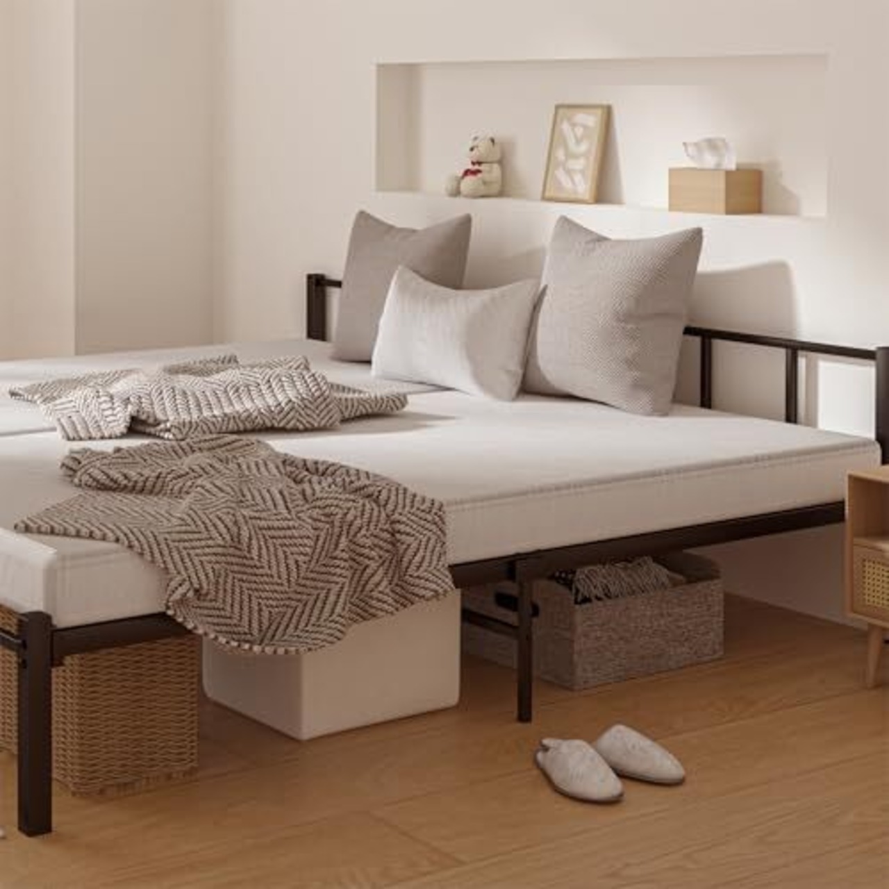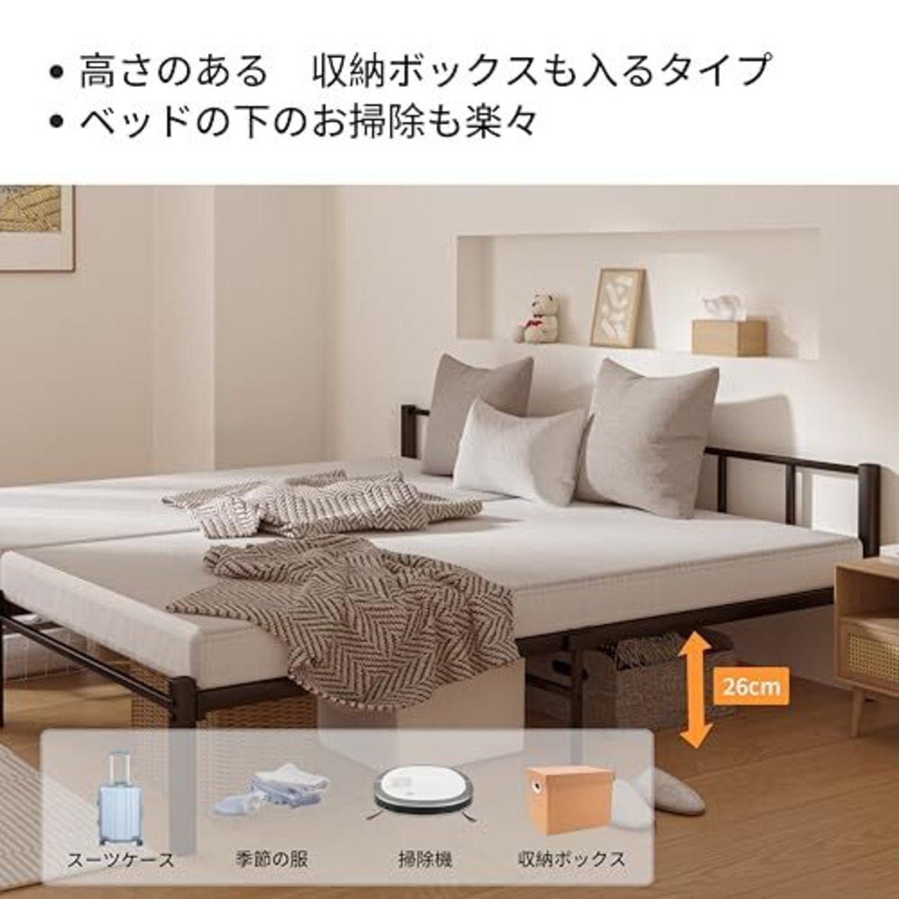【オペレーション収納能力】ベッド下の高さは26cmで、スーツケースなどを収納することが便利で、ローボード掃除機をすることも簡単です。衣類、本、小物などを便利に収納できます。マットレスを支えるのスノコ仕様で3.0厚いメッシュですので、薄いマットレスでも十分な快適さを実感できます。