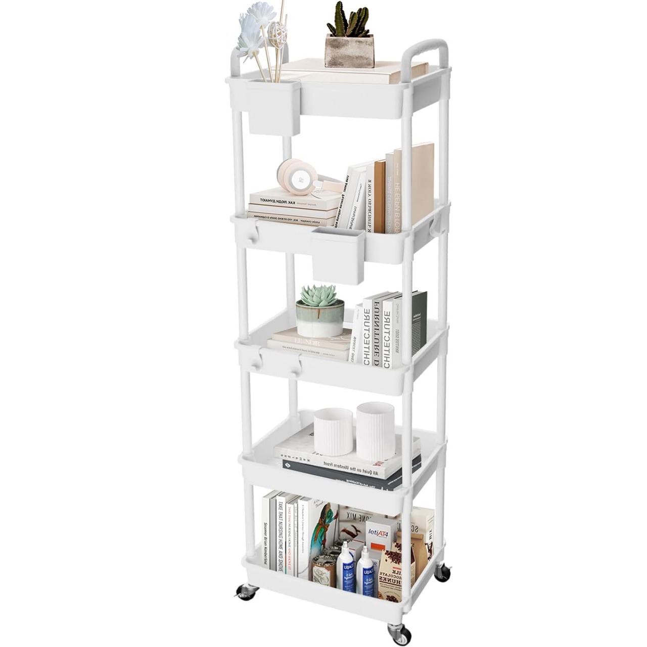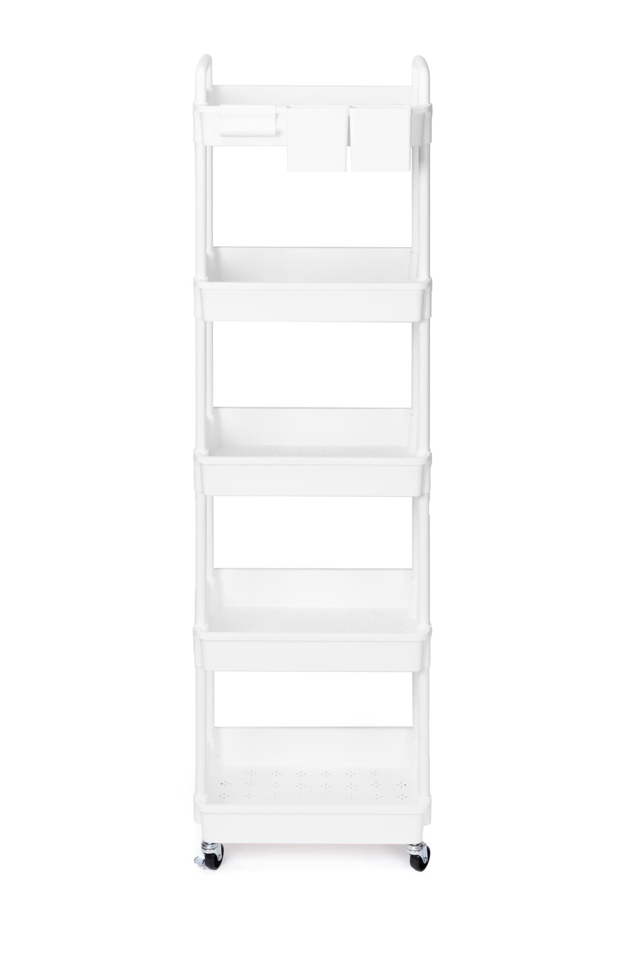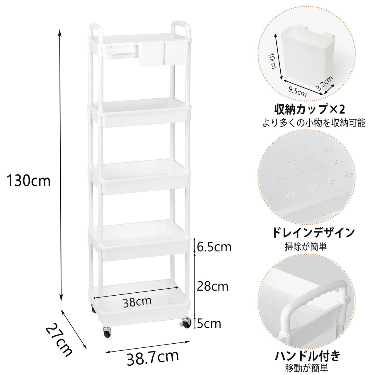 SIUSA キッチンワゴン ワゴン キャスター付き 5段 スリム 収納ワゴン 大容量 収納カート ハンドル/収納カップ付き ペットボトル収納 洗面所 台所 トイレ 浴室 冷蔵庫横 組立簡単 幅38×奥行27×高さ130cm ホワイト