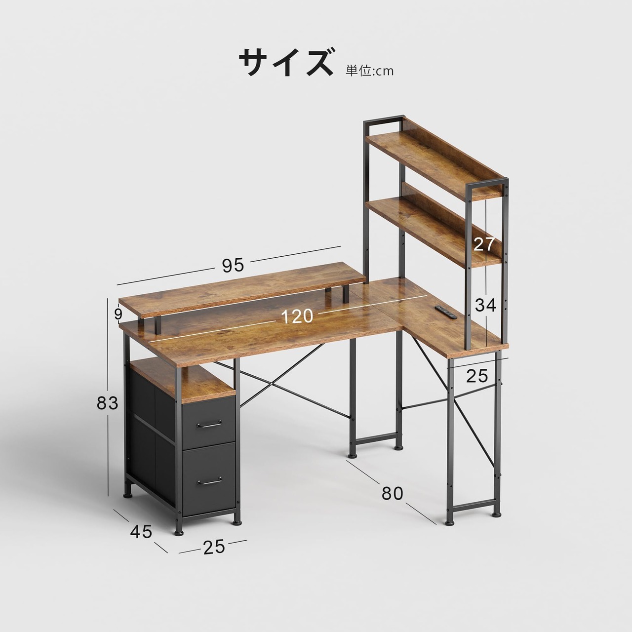 Maihail l字デスク LEDライト付き 机 pcデスク desk 桌子 パソコンデスク コンパクト 家具 table 学習机 引き出し付き 上収納棚付き ワークデスク 幅120*奥行80cm ピンテージ
