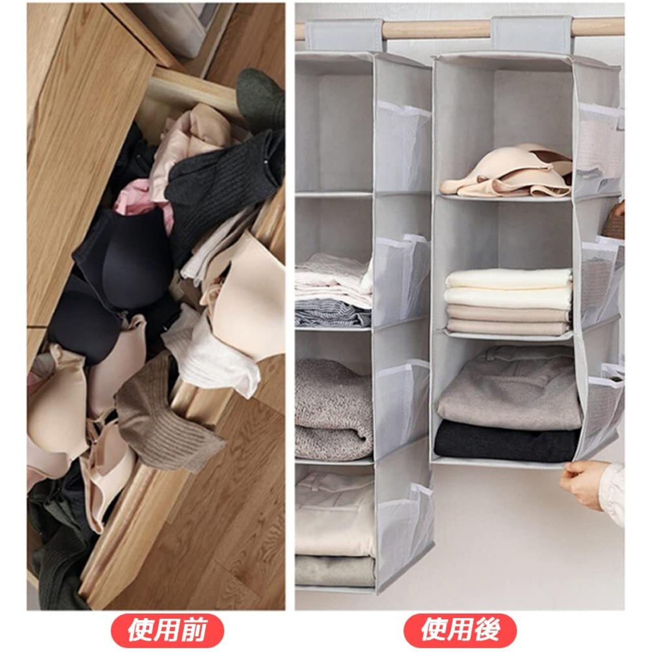【収納力抜群】見やすく取り出しやすい3段で大容量の吊り下げ収納ラック、収納の心強い味方、両側にブラーや靴下などの12ポケット付き、幅広なので、収納力も抜群です。クローゼットのロッドに掛ける、だけ小物類からジーンズやベルト、帽子、靴箱迄収納られます。お好き次第自由にご愛用頂けます、毎日服を選ぶのが楽しくなります。