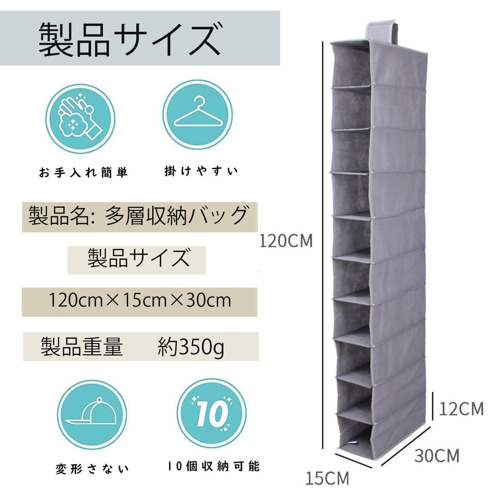 吊り下げ収納 衣類ラック 10段 クローゼット収納 タオル 下着 バッグ 吊るす収納 大容量 ポケット付き 折りたたみ グレー
