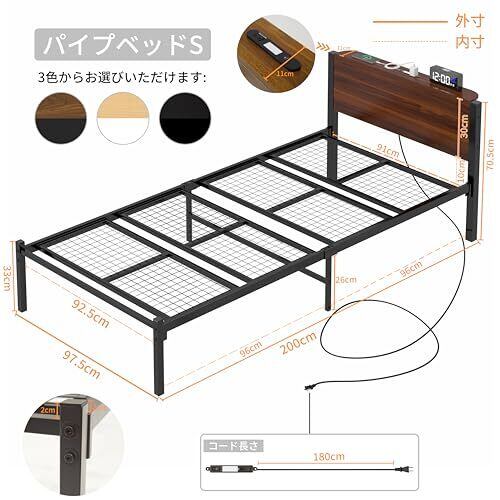 LunarLight スチールパイプベッド ベッドフレーム 幅97.5奥行211高さ70.5cm すのこ 静音 シングル bed frame コンセント付き LEDライト付き 宮棚付 通気性 耐久性 耐荷重400kg ベッド下収納 頑丈 組立簡単 シンプル おしゃれ 日本デザイン (ダークブラウン ヘッドボード付き)