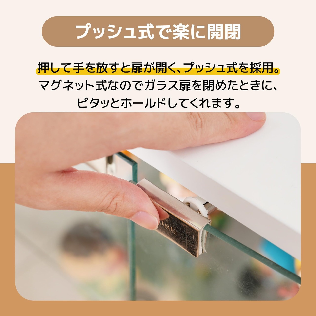 【ワンプッシュで簡単に開閉できます】ガラス扉部分はマグネットプッシュ式を採用、取っ手の凹凸が無く、ワンプッシュで簡単に開閉していただけます。 【ホコリから守るガラス扉】扉を付けることで、大切な推しグッズをホコリから守り、日々のお手入れを簡単に!こちらも強化ガラスを使用しています。