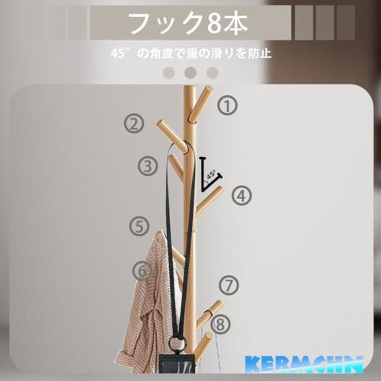 【強力な収納力】:木製のスタイリッシュな丸底洋服ハンガーはコンパクトなデザインで、コート、帽子、ハンドバッグ、ブリーフケース、傘などを掛けることができる8つのフックが含まれています。 各フックには5KGの耐荷重があり、優れた収納機能を備えています。 フックの傾斜角度は45度で、衣服の脱落を効果的に防止できます。 玄関やリビング、寝室などの限られたスペースを有効活用できる木製ハンガーです。