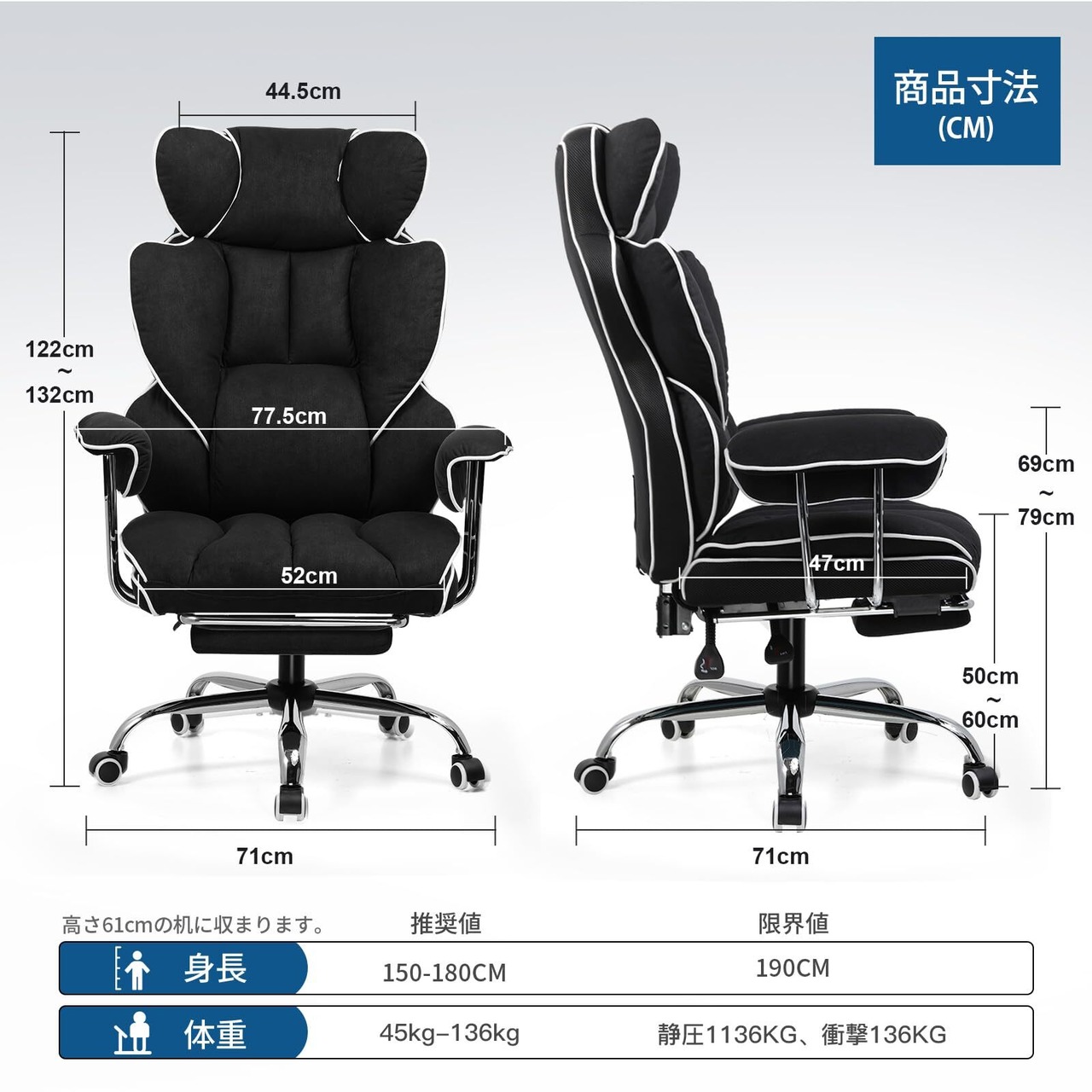 【通気性良好のファブリック】通気性がよくファブリック素材を採用し、耐久性が高く、破れにくいです。風通しがよく、長時間座っていてもムレがなく快適です。肌ざわりがさらさらなことも特長です。ファブリック以外にも、清掃しやすいPUレザーも選択できます。