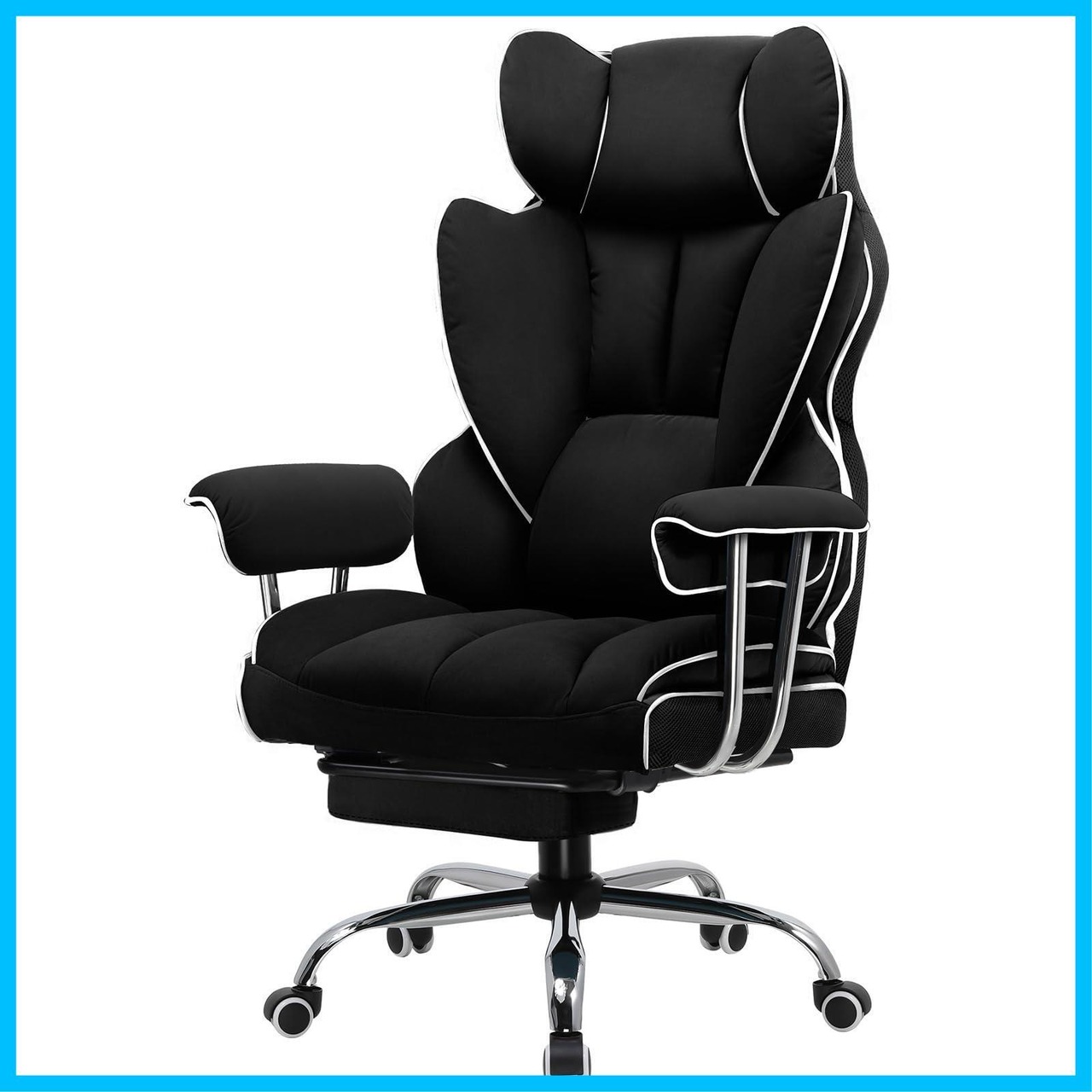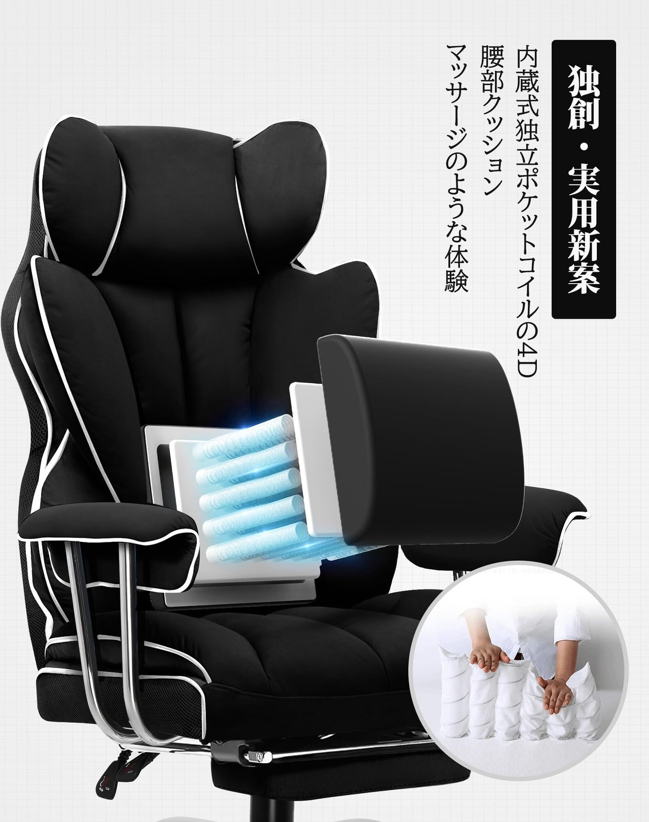 【疲れ取れる分区サポート】頭から脚まで科学的に分区サポートし、効果的に圧力を軽減し、疲労を解消できる。ソファのような座り心地を実現するために3種類の素材を採用。表面はふわふわしたPP綿を採用、座面の下は安心の非再生ウレタンを採用。さらに、背もたれの中にに独立ポケットコイル入れ、 ソファみたい座り心地をゲーミングチェアで実現。