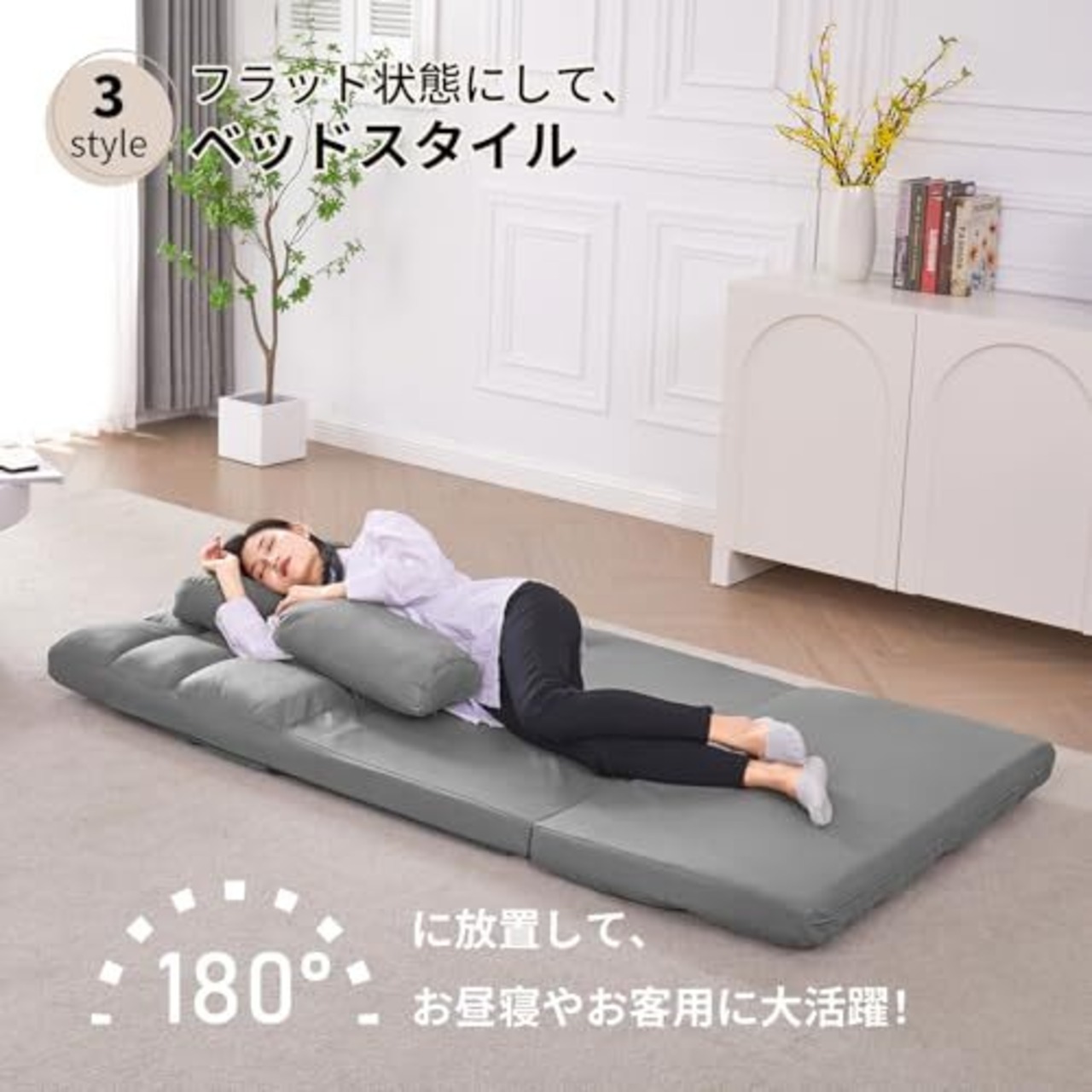 「三つのスタイルを選ぶことができる3WAYソファ」普段は座椅子として使用し、座面を伸ばせばベッドとしても使用できます。背もたれのリクライニング機能と座面の折り畳みを利用して、カウチソファーやベッドにも変身します。形が変えられるので、一人暮らしやリビングなど場所を限らずお使いいただけます。