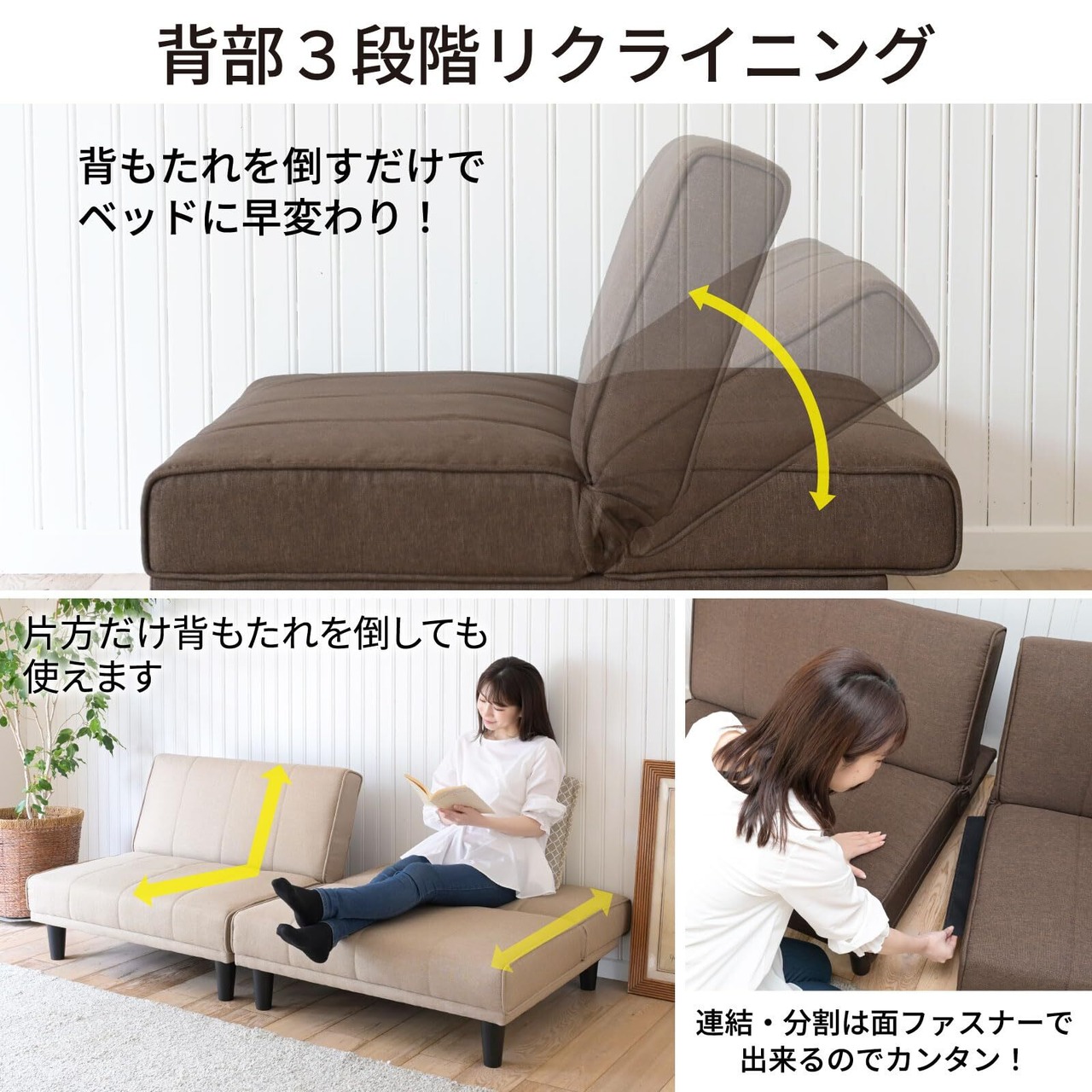 【リクライニング可能】背もたれは3段階でリクライニングできます。背もたれを倒すだけでカンタンにベッドに早変わりするので、来客用のベッドとしても活躍します。