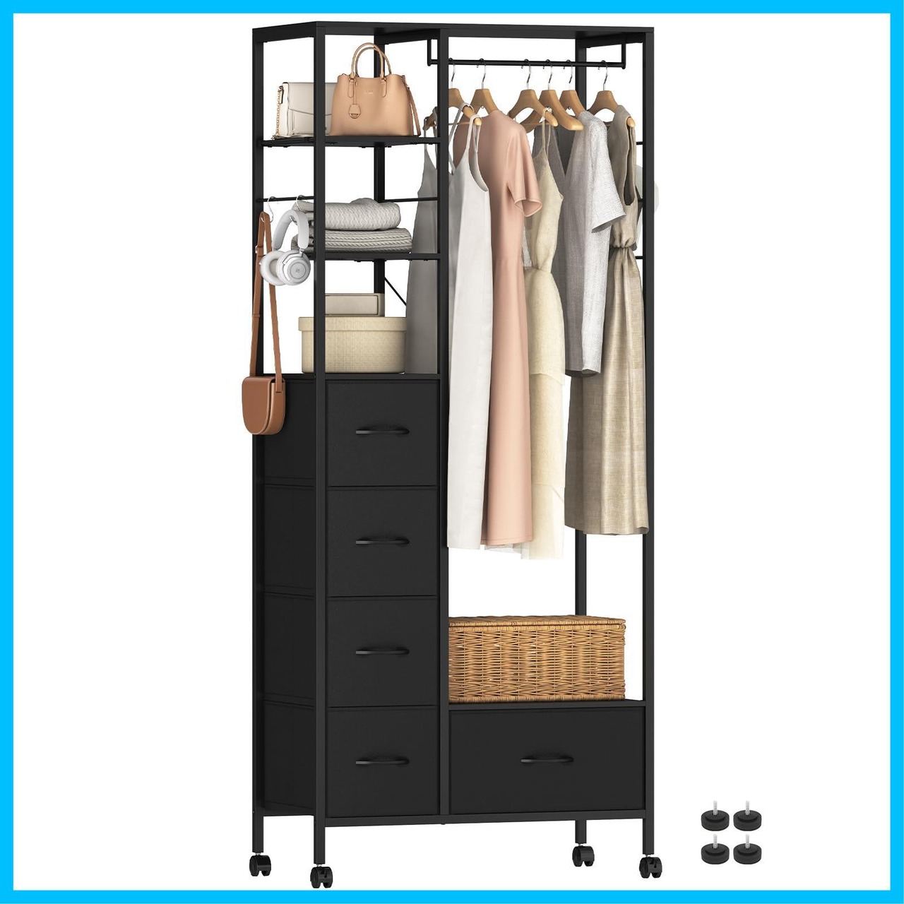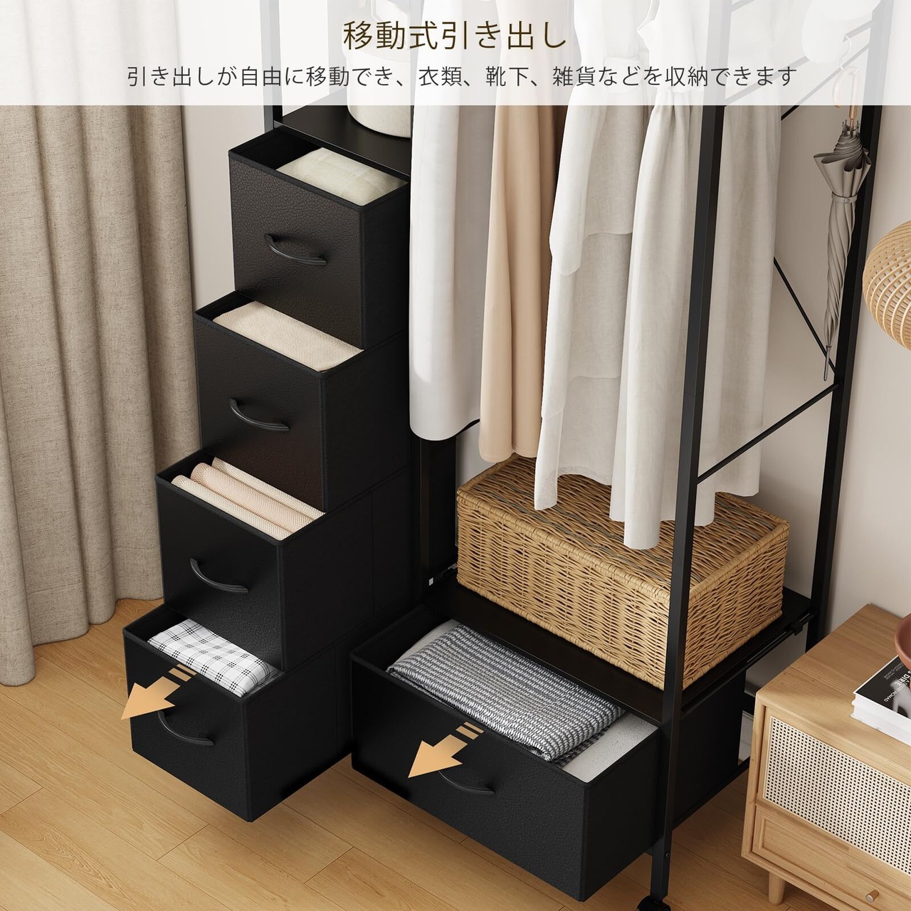 LunarLight ハンガーラック ワードローブ 引き出し付き 大容量 頑丈 全体耐荷重200kg キャスター付き 棚板可動式 収納付き 洋服収納 パイプハンガー 洋服掛け 衣類 衣装 クローゼット サイズ 幅80奥行40高さ188cm (ブラック)