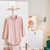 【ドアやクローゼット扉に掛けるだけの上下二段ハンガー】天然木を使った上下2段ハンガー。ランドセルやリュックサック、ショルダーバッグからストールなどのファッション小物や洋服のハンガーなども掛けられる丈夫で使いやすいハンガーです。