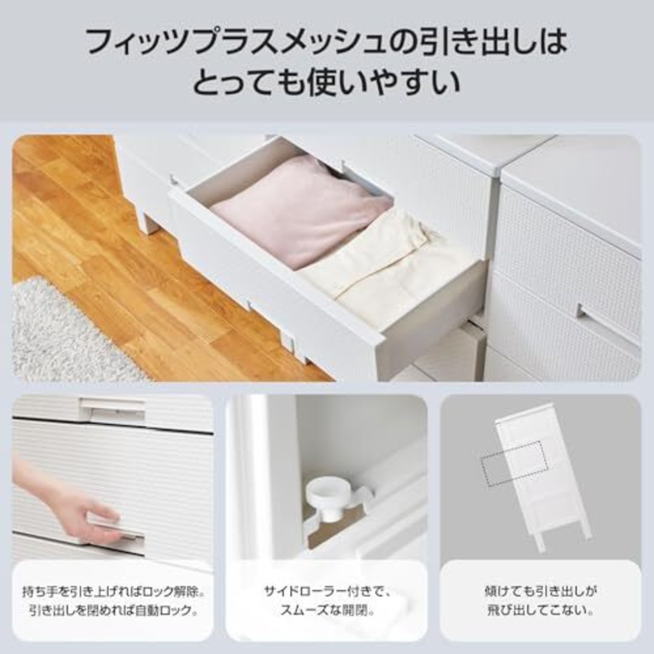 Amazon.co.jp限定商品で使いやすさとデザインにこだわった収納チェスト。お掃除にも便利な「お掃除ラク脚」付きでお掃除ロボットやスティック掃除機もしっかりと入る設計。引き出しは引き出しを閉めると自動でロックし、持ち手部分を上にあげるとロック解除できます。