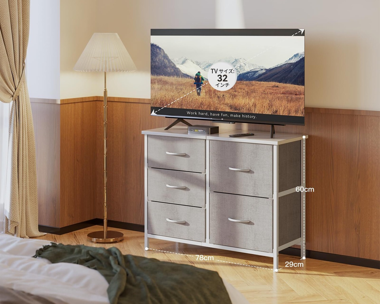 【さまざまな場所で活躍】このチェストは、寝室、クローゼット、リビングルーム、子供部屋、廊下、ベッドサイドに最適です。ランプ、花瓶などの装飾品を木製天板に置くことができます。