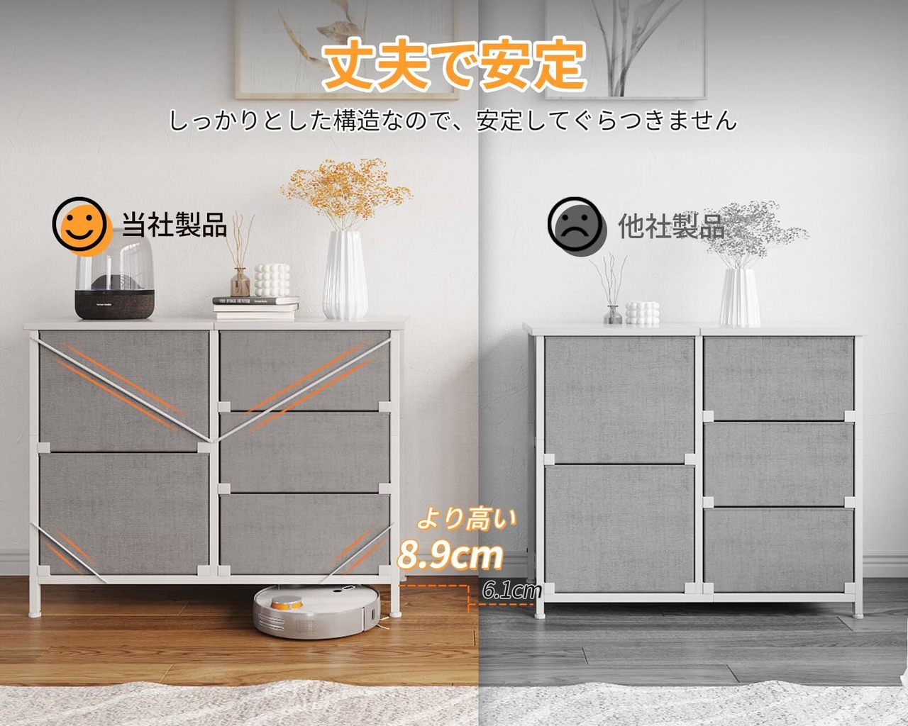 【転倒防止&安全なデザイン】全シリーズは壁固定の部品が付いて、壁に固定すれば地震にあっても倒れないから安全です。チェストのフレームは上質で頑丈なスチール素材を採用されるため、長持ちのうえ、安定性・耐摩耗性に優れています。しっかりとした構造なので、安定してぐらつきません。