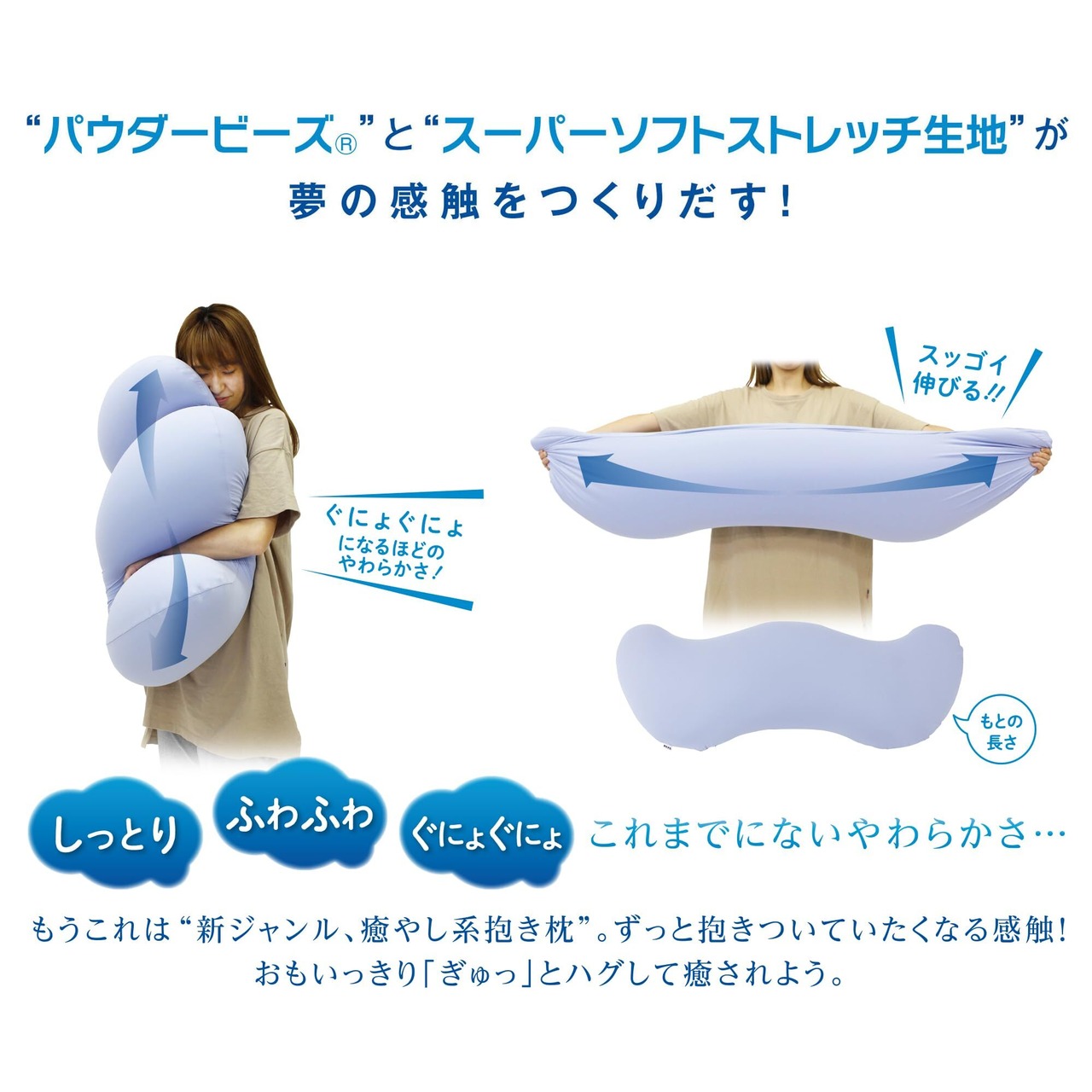「しっとり」肌触りのよい生地に、「ふわふわ」の雲のような触感、「ぐにょぐにょ」と自由に形を変えて体に寄り添ってくれる抱き枕は、ずっと離れたくない心地よさ。