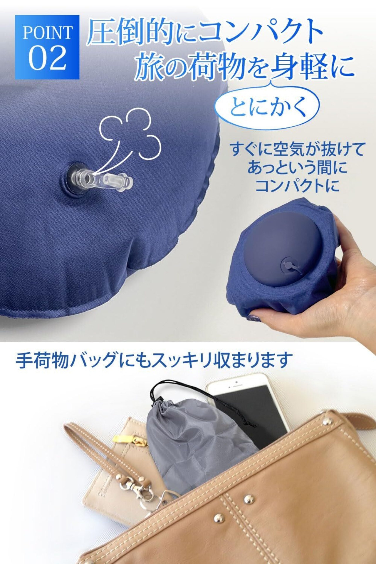 【 圧倒的にコンパクト、旅の荷物をとにかく身軽に 】 栓を抜くとすぐに空気が抜け、あっという間にコンパクトになり、かさばらずに持ち運ぶことが出来ます。軽量&コンパクトで荷物にならないため、海外旅行はもちろん、ちょっとした外出にも活躍、とにかく身軽に持ち運びたい方におすすめです。さらに災害用に用意しておくと安心です。