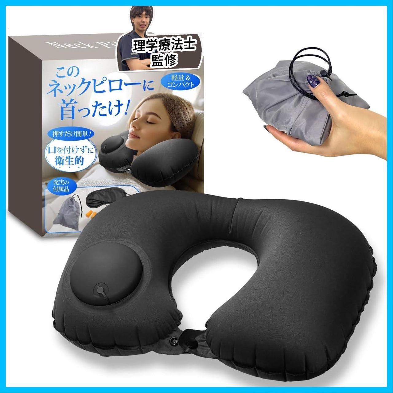 ネックピロー 【楽に寝付けるネックピローx圧倒的にコンパクト】[空気入れは必要無し(本体にポンプ有り)x手荷物でも邪魔にならない] [NEW ALLIANCE(ニューアライアンス)] (ブラック)