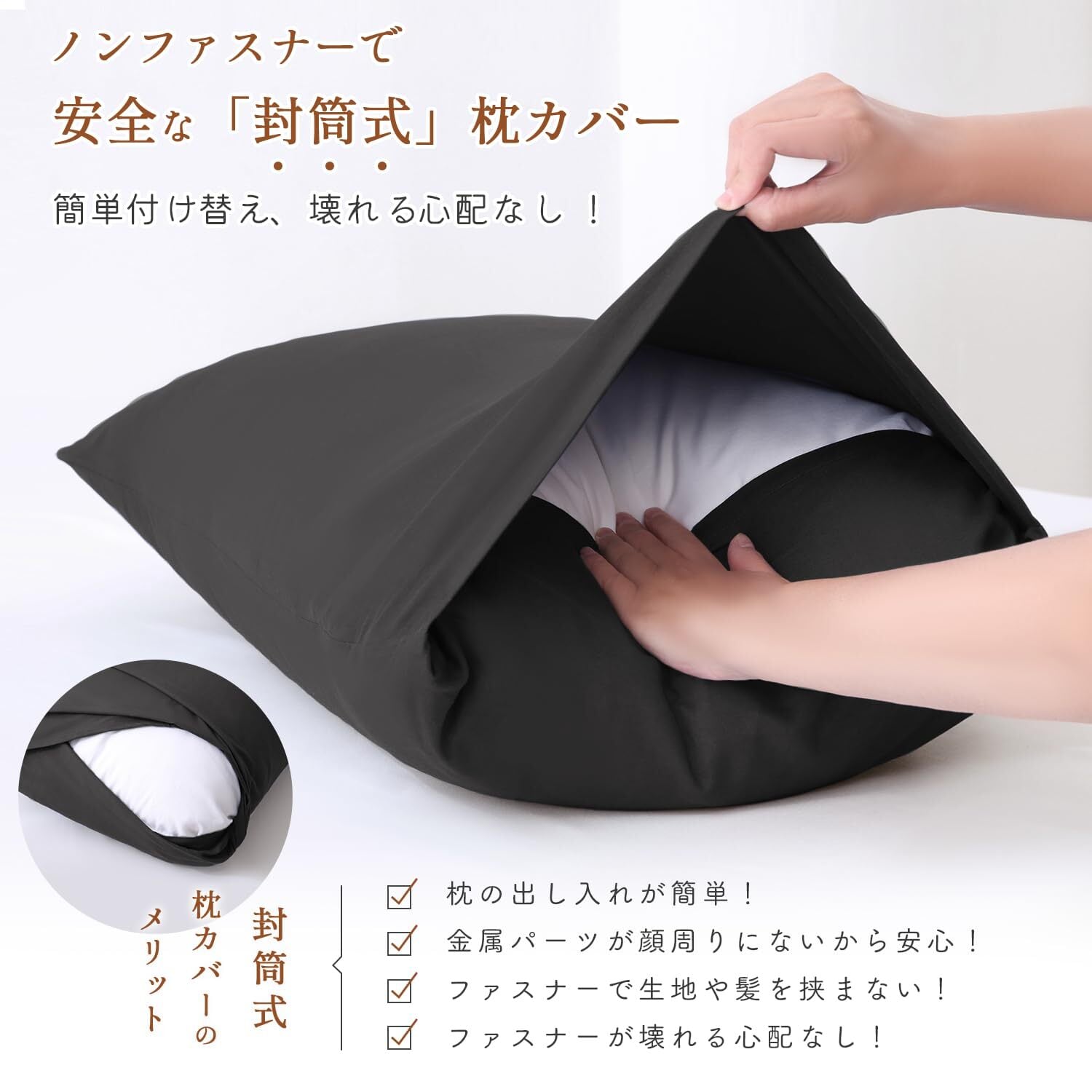 【ストレスフリーの封筒式デザイン&高耐久】ファスナーやボタンを使わない封筒式デザインを採用。寝返りを打っても肌に違和感なく快適に眠れます。さらに、枕をしっかり包み込む仕様なので、ズレにくく、取り替えもスムーズです。丈夫な縫製で毛玉やほつれができにくく、毎日使っても長持ちする高耐久仕様。