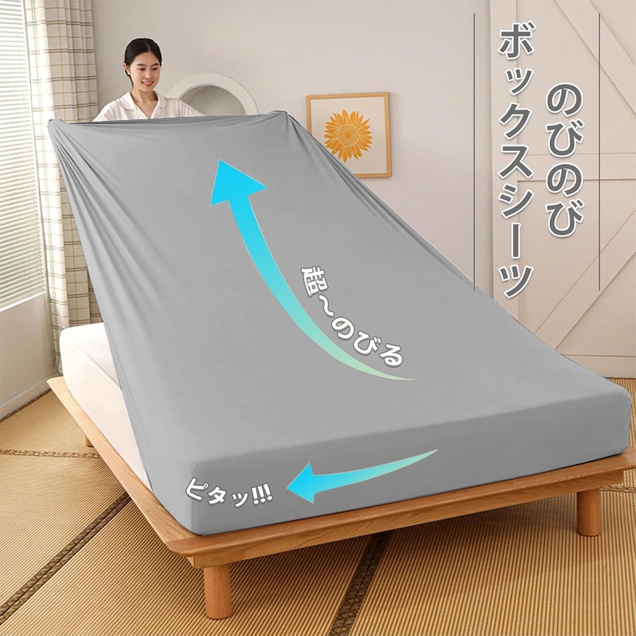 【3Dストレッチ生地&伸びるベッドシーツ&アイロン要らず】お客様のご要望にお応えできるように、仕上がりの美しい、綺麗にフィットするシーツを作りました。ポリウレタン混の生地なので伸縮性に優れタテにもヨコにも自由自在に伸びる素材だから手間をかけず簡単に装着できます。半端なサイズもキレイにフィット。シワになりにくいから気になる取り付け時のシワも アイロンいらずでキレイにフィット。面倒家事も短縮できます。