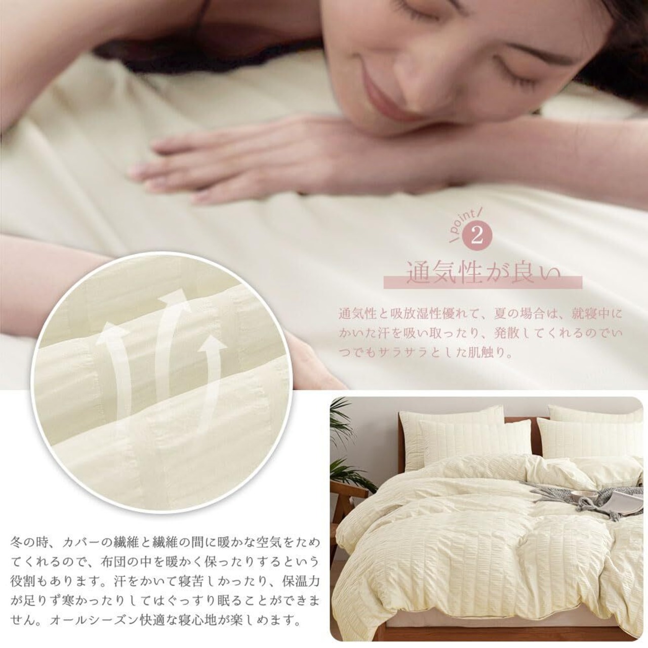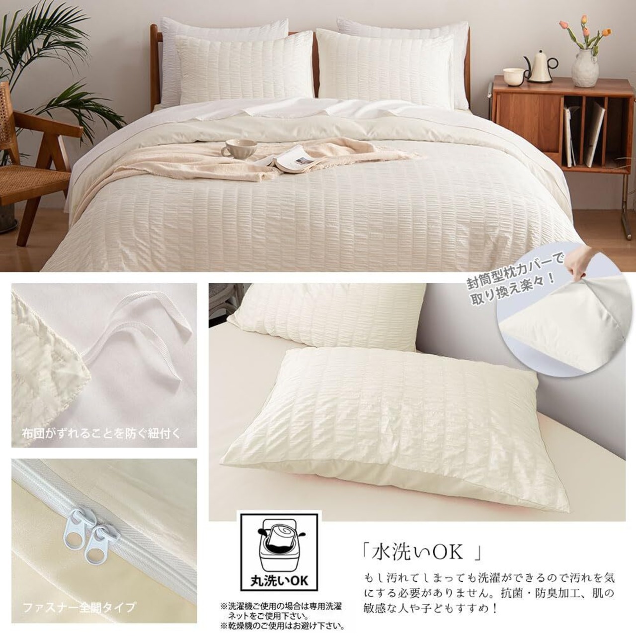 布団カバーセット シアサッカー生地 シングル ダブル 寝具カバーセット 3点セット 掛け布団カバー ボックスシーツ 枕カバー 可愛い 柔らかい 快適 通気性 速乾タイプ 丸洗い オールシーズ(シングル3点セット、アイボリー)
